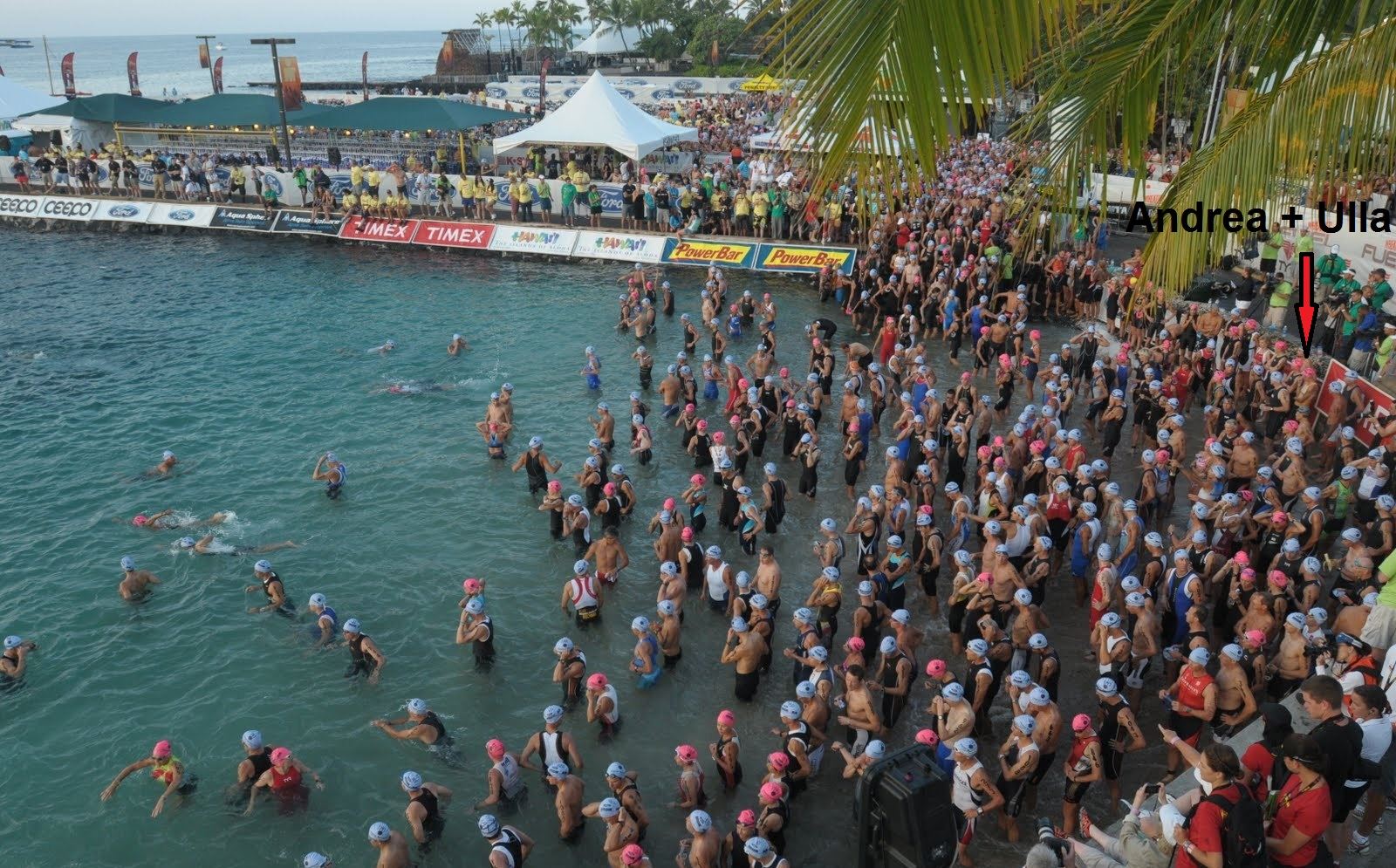 Unsere innere Uhr tickt noch immer in Deutschland. Pünktlich um 3.oo Uhr haben Werner und ich ausgeschlafen. Wir liegen dann immer eine Weile wach bis wir langsam wieder einschlafen. Es ist schon beeindruckend, wenn man im Bett liegt und das Meer und die Wellen hört. Pünktlich um 6:00 Uhr klingelt der Wecker. Nach einem kurzen Frühstück packen wir unsere Schwimmsachen und dann geht es in Richtung Pier. Werner fährt mit dem Jeep und wir anderen Joggen an den Strand. Es ist Wahnsinn wie viele Leute bereits morgens in aller Frühe am Strand sind. Inzwischen gibt es auch von Ironman einen Stand an dem wir unsere Sachen abgeben können. Das ist ganz praktisch, da man keine Angst vor Diebstahl haben muss. Es gibt auch einige Triathleten, die mit dem Rad kommen.
