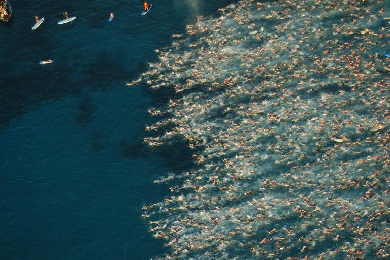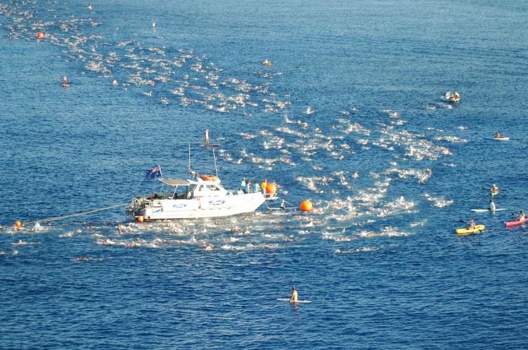 Es ist noch sehr früh und ich bin bereits fertig. Ich lasse mir noch den Rücken eincremen. Danach noch einmal kurz zum Rad und schauen, dass alles in Ordnung ist. Inzwischen habe ich etwas hunger, Walter ist so freundlich und überlässt mir einen Riegel. Um 6:30 Uhr fällt dann der Startschuss für die Profis. Jetzt haben wir noch 30 Minuten Zeit. Wir gehen schon langsam zum Wasser und stellen uns unten hin. Einige schwimmen sich bereits ein. Das muss ich so früh noch nicht machen. 30 Minuten sind eine lange Zeit. Um 6:45 Uhr fange ich dann auch an in Richtung Startlinie zu schwimmen. Es werden immer mehr Leute, teilweise ist es im Wasser ganz schön eng. Die Minuten ziehen sich. Dann endlich, der Startschuss fällt. Es ist nicht möglich sofort zu schwimmen da sich alles noch etwas staut. Die vorderen Reihen müssen zuerst einmal wegkommen, dann können wir langsam auch anfangen. Die ersten 500 Meter sind ein ganz schönes Gedränge. Ich versuche mich aus allem rauszuhalten. Wenn es zu eng wird mache ich lieber mal langsam bevor ich einen Tritt oder Schlag abbekomme. Nach und nach reguliert sich alles. Es kommt nur noch ab- und an vor, dass es mal eng wird. Ansonsten kann man einigermaßen schwimmen. Ich versuche mich auf die Athleten zu konzentrieren und ignoriere meine Übelkeit. Das Meer und die Wellen sind nicht mein Ding. Vor mir schwimmt einer ohne Beine, das ist sehr beeindruckend. An der Wendeboje wird es etwas eng, dummerweise bin ich auch noch an der Innenseite. Aber irgendwie geht es um die Kurve und dann geht es normal weiter. Inzwischen habe ich etwas die Orientierung verloren. Ich habe Probleme bei den Wellen die Bojen zu erkennen. Aber solange noch Leute um mich sind, kann ich ja nicht so falsch schwimmen. Ich habe kein Gefühl wie lange die Strecke noch ist,