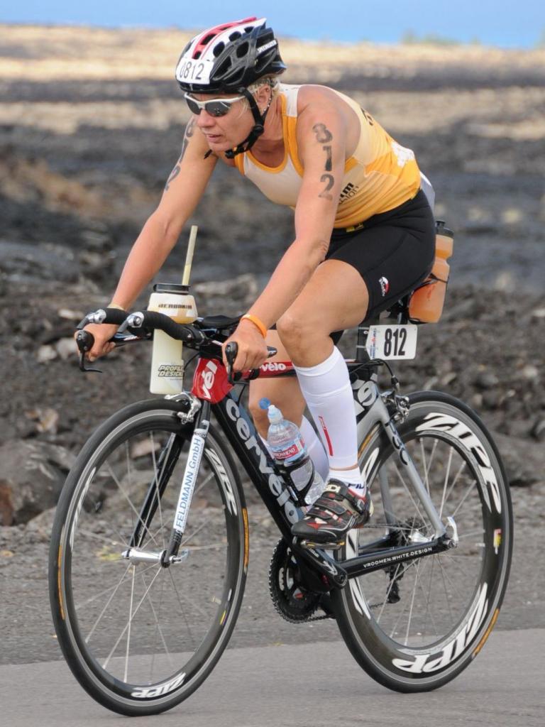 Jetzt heißt es tapfer weitertreten und den Lenker festhalten. Teilweise sind die Böen so stark, dass das Rad um einen Meter versetzt. Für mich geht es jedoch einigermaßen, da ich bereits Sonntags meine Erfahrung mit dem Wind gemacht habe. Ich kann relativ gut mit diesen Böen umgehen. Problematisch ist lediglich ab und an das Trinken bzw. Schalten. Je nach dem, wie stark die Böen gerade sind lasse ich beides ausfallen. Es ist jedoch beruhigend, dass Männer wie Frauen mit dem Wind kämpfen. Dann kommt der Wendepunkt und man weiß genau, dass dieser besch… Wind wieder kommt. Man fährt jetzt mehr abwärts und daher auch schneller, der Wind ist jedoch derselbe. Ich motiviere mich indem ich mir sage weitertreten und Lenker festhalten. Und siehe da, es funktioniert. Nach dem wir wieder rechts in Richtung Kona abbiegen ist der furchtbare Seitenwind vorüber. Jetzt bläst er lediglich von vorne. Ich schaue ab und an auf meinen Tacho und bin bestürzt, dass ich keine Geschwindigkeit bekommen. Aber es ist beruhigend, dass es den anderen ebenso geht. Man soll es nicht glauben, aber dieser Gegenwind bleibt die ganze Strecke über. Teilweise gibt es noch ein paar Anstiege, die man sich hoch kämpft.