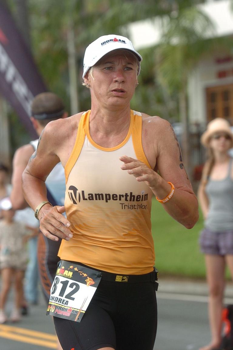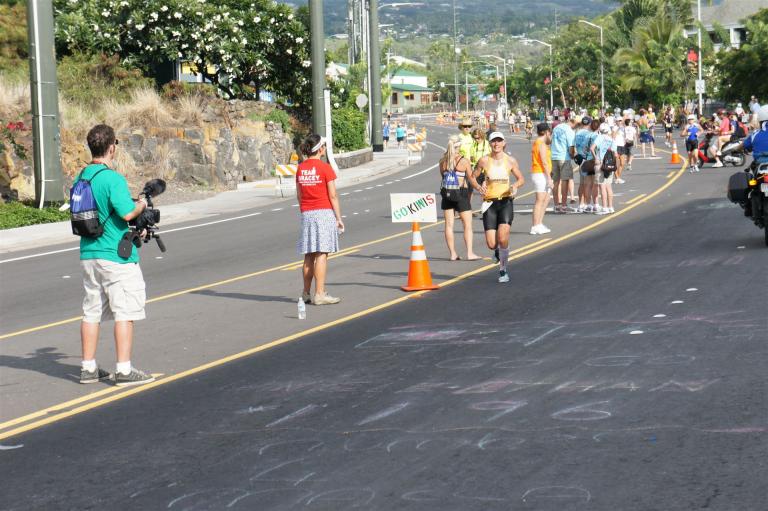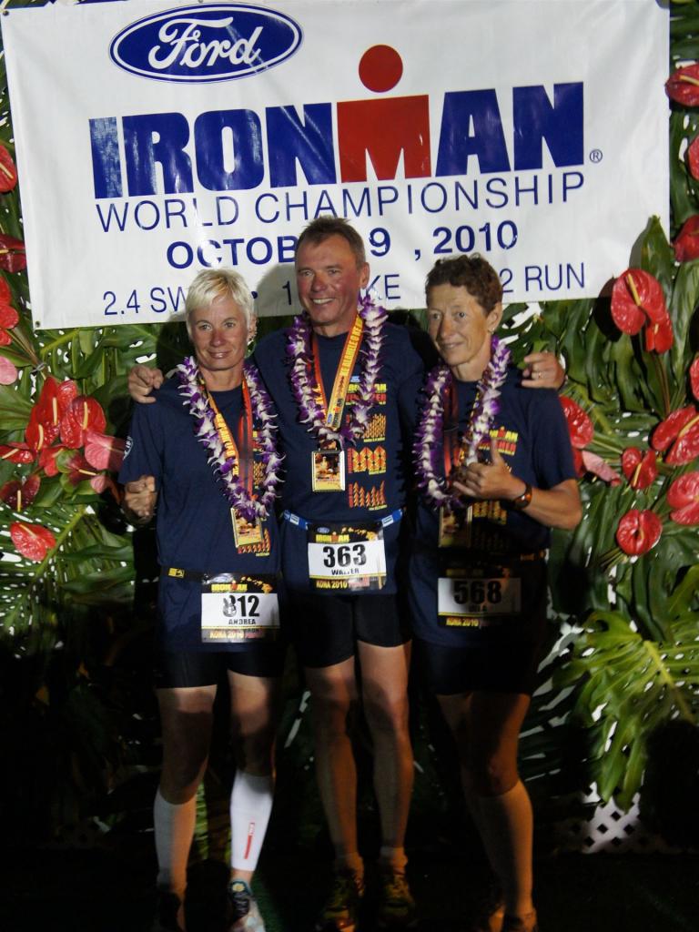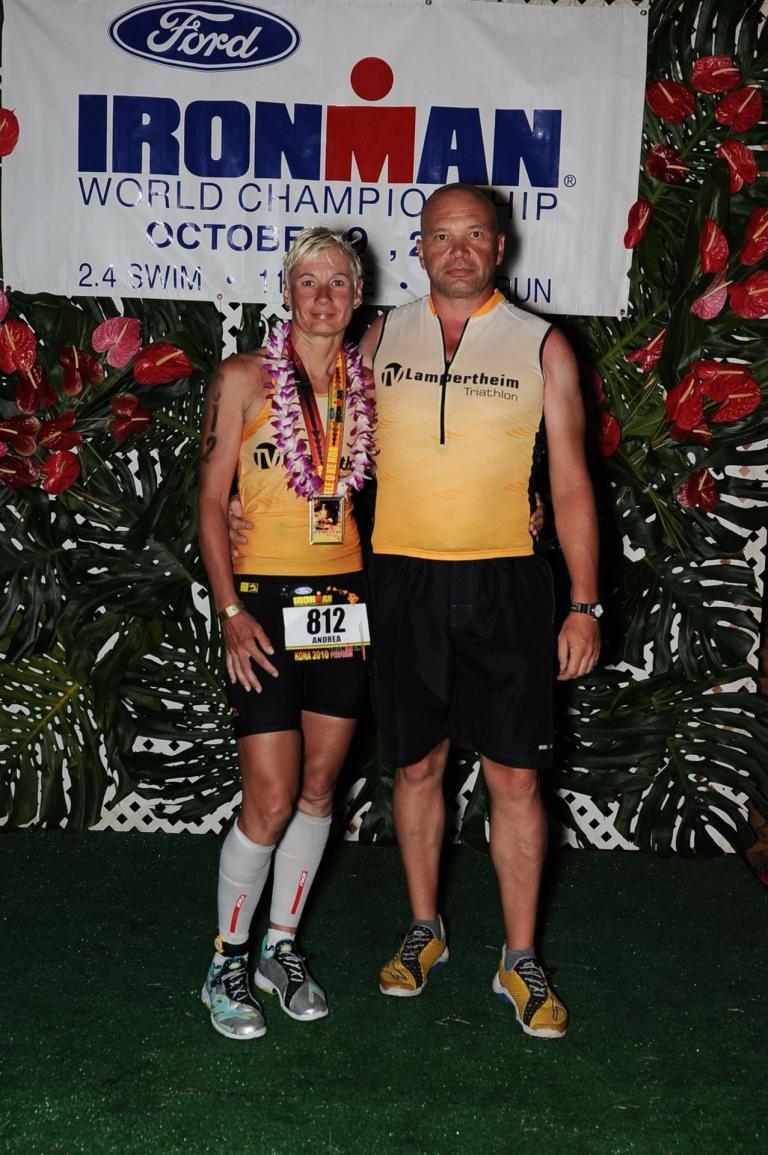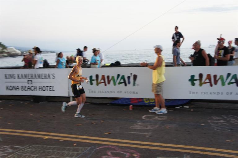 Aufgrund der Wärme, die Sonne strahlt unbarmherzig beschließe ich, nicht am Limit zu laufen. Da ich nicht weiß, wie mein Körper das Klima verkraftet, gehe ich lieber auf Nummer sicher. Ich wähle ein für mich angenehmes Tempo und laufe nun von Verpflegungsstelle zu Verpflegungsstelle. An jeder Verpflegung halte ich an und trinke etwas, ich denke das ist sehr wichtig für den Körper. Ansonsten nehme ich alle greifbaren Schwämme und fülle mir Eiswürfel unter die Mütze. Diese leichte Abkühlung ist eine Wohltat. Irgendwann komme ich auf die Idee und schütte die Eiswürfel ebenfalls in mein Trikot. Bei jedem Schritt macht das Eis lustige Geräusche. Auf der Laufstrecke in Kona sind relativ viele Leute am Straßenrand. Viele rufen die Startnummer und feuern mich an. Ich kann jeden Meter dieses Laufes genießen. Ich fühle mich vom ersten Meter an gut und bin auch zuversichtlich, dass ich ins Ziel komme. Dann geht es auf den Highway. Hier gibt es keinerlei Schatten mehr, der Asphalt strahlt die Hitze ab. Jetzt muss ich „nur“ noch bis zum Energy Lab und wieder zurücklaufen. Das sind nur noch ca. 17 Meilen. Aber es stört mich in keinster Weise. Ich freue mich, winke den Zuschauern zu und versuche möglichst viele Leute zu überholen. Mein Magen fängt leider an etwas zu rebellieren, daher trinke ist vorerst fast nichts und kühle nur von außen. Ich hoffe, das geht vorüber. Während ich raus laufe kommen mir auch viele Leute entgegen. Einige gehen, sie können nicht mehr laufen. Manche Athleten, die ich überhole, rufen mir zu „good job“ das finde ich super nett. Unterwegs steht auch Hannes mit seinen Leuten und machen Party. Da läuft man gleich wieder viel leichter. Dann kommt die Abbiegung zum Energy Lab. Hier ist auch eine tolle Stimmung. Es ist jedoch noch ein langes Stück zum Meer und dann geht es noch einmal rechts ab. Am Wendepunkt stehen 3-4 Männer und feuern die Leute an. Ich tanze etwas mit ihnen und jubel ihnen zu, die freuen sich total. So, jetzt heißt es nur noch zurücklaufen. Nur noch, es sind sicherlich noch 12-13 km. Aber was ist das schon. Mir geht es gut ich fühl mich sauwohl. Wieder auf dem Highway angelangt läuft mir Walter entgegen. Es geht ihm ebenfalls gut er winkt und ruft mir zu. Jetzt habe ich das Gefühl ich bin auf dem Heimweg. Bei den Verpflegungsstellen stehen sie inzwischen mit großen kalten Wasserflaschen da und fragen, ob sie einem Wasser über den Kopf schütten sollen. Ich bin dankbar für jede Abkühlung und sage nicht nein. Vor mir läuft ein junger Mann, auf einmal bleibt er stehen, die Beine ganz starr. Er hat einen furchtbaren Krampf. Ich frage ihn, ob ich ihm helfen kann, er winkt jedoch nur ab und sagt, ich soll weiterlaufen. Die Strecke zurück zieht sich dann doch noch. Ich halte noch immer an jeder Verpflegungsstelle an, ich gehe auf Nummer sicher. Unterwegs hatte mal mein rechter Oberschenkel etwas weh getan, aber das ging irgendwie wieder weg. Ein Radfahrer fährt ein Stück auf dem Highway neben mir her und ruft Lampertheim Go. Es ist ein Deutscher der mich anfeuert. Er meinte ich wäre sicherlich ein Daylight Finisher. Ich rufe ihm zu, dass ich keine Ahnung habe, da ich keine Uhr dabei habe. Er meinte nur, du bist sicherlich noch bei Tageslicht im Ziel. Auf dem letzten Stück habe ich eine Frau ca. in meinem Alter überholt. Sie hat mir zugerufen „good job“ und sich an mich drangehängt. Wir sind dann eine ganz Zeit zusammen gelaufen. Das fand ich sehr angenehm. Irgendwann hat sie abreißen lassen, ich hab dann etwas langsam gemacht und gesagt, sie solle doch mit weiterlaufen. Sie meinte dann, nein sie kann nicht mehr so schnell und dann bedankte sie sich noch, dass ich sie mitgezogen habe. Dann kommt lediglich noch ein Anstieg auf dem Highway, wobei man inzwischen jeden Höhenmeter in den Knochen merkt. Wieder in Kona angekommen geht es nur noch die Palani Road runter. Abwärts laufen ist inzwischen auch nicht mehr so angenehm. Jetzt noch ein Quadrat laufen. Hier überhole ich noch einige. Es sitzen noch immer viele Zuschauer am Straßenrand und rufen einem zu, dass man gleich im Ziel ist. Auf dem Ali Drive nehme ich Tempo raus und genieße jeden Meter. Ganz viele Leute jubeln mit zu, rufen meine Startnummer oder meinen Namen und klatschen mich ab. Das Gefühl ist unbeschreiblich. Inzwischen kann ich hören, wie der Sprecher bereits meinen Namen, Nation…..und ähnliches ruft. Jetzt sind es nur noch ein paar Meter und ich bin im Ziel. Es geht mir super gut und ich weiß schon jetzt, dass wenn ich die Möglichkeit habe, wieder nach Hawaii kommen werde. Im Ziel bekommt man Blumen und ein Handtuch umgehängt. Eine Betreuerin kümmert sich um mich und führt mich nach hinten. Ich sage ihr, dass es mir gut geht und ich nach meinem Mann suche. Sie fragt mich noch mehrmals ob alles in Ordnung ist bevor sie mich alleine lässt. In der Menge erkenne ich dann auch schon Werner. Er ist super stolz auf mich. Erstaunlicherweise habe ich sofort Lust auf Cola und Pizza. Was ich dann auch in mich rein stopfe. Ich hole noch mein Finisher Shirt und meine Urkunde ab. Zum Nachtisch esse ich noch Vanille-Eis. Das einzige was mir weh tut sind die Füße. Durch die nassen Schuhe und Strümpfe (es war ja alles klatsch nass, da ich ja ständig Wasser über mich geschüttet habe) habe ich mir einige Blasen sogar auf den Fußsohlen gelaufen. Ich lasse noch ein Foto mit der Medaille machen und ein Foto noch zusammen mit Werner. Nach und nach kommen Walter und Ulla ins Ziel. Es geht beiden auch sehr gut. Wir lassen noch ein Foto von uns dreien machen. Dann holen wir unsere Sachen und fahren mit den Rädern zurück ins Hotel. Es war ein unvergesslicher Tag.