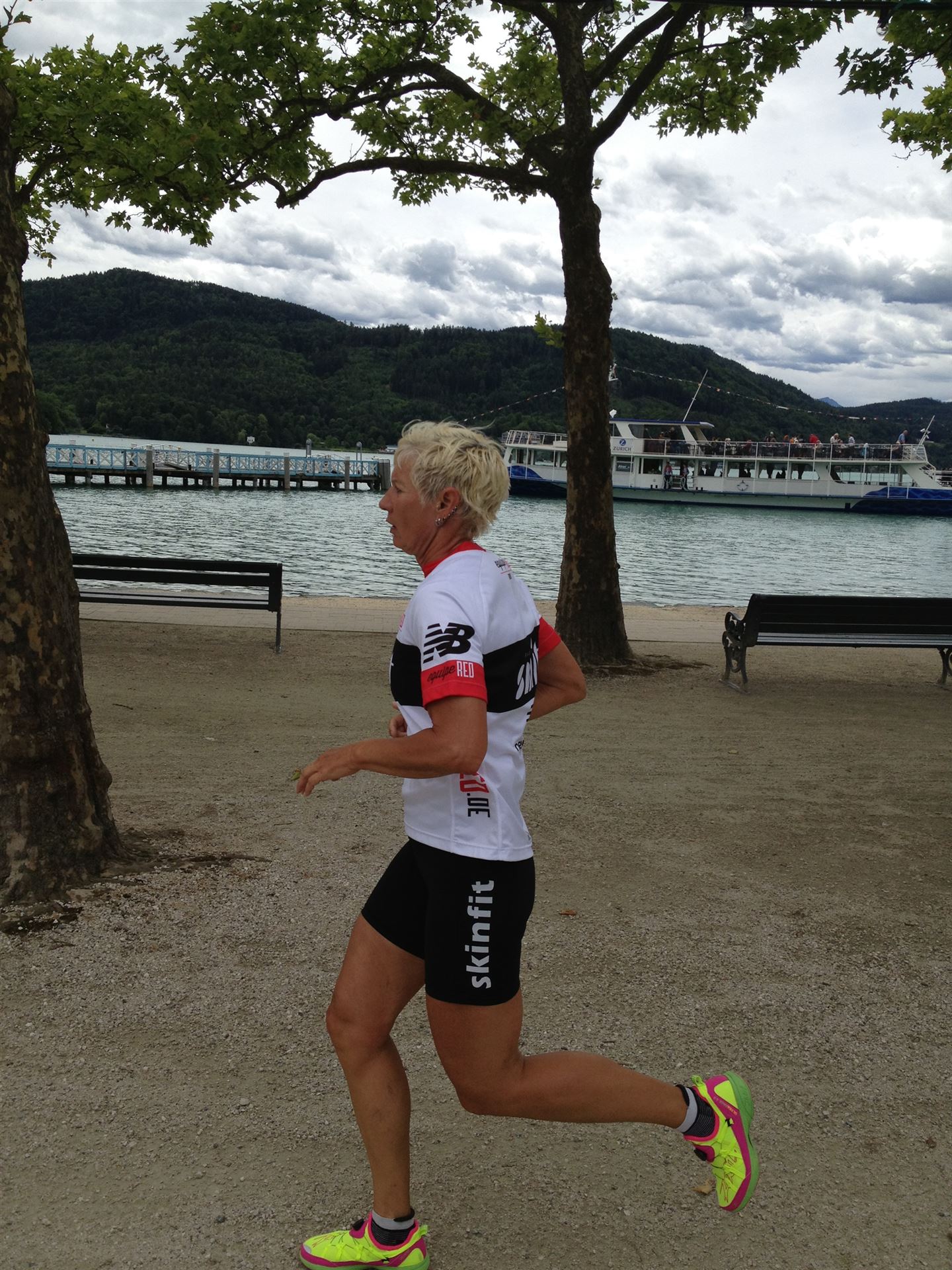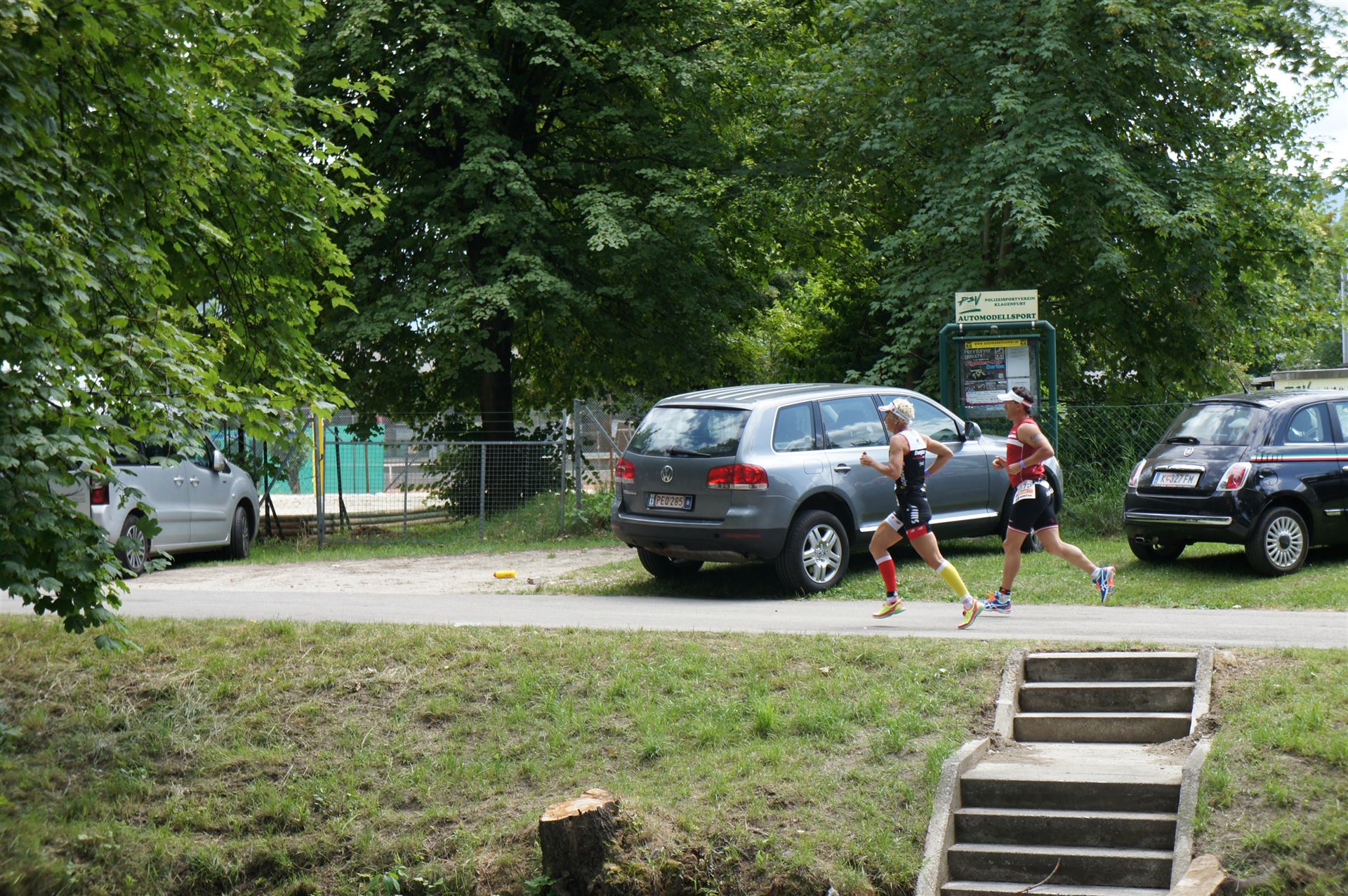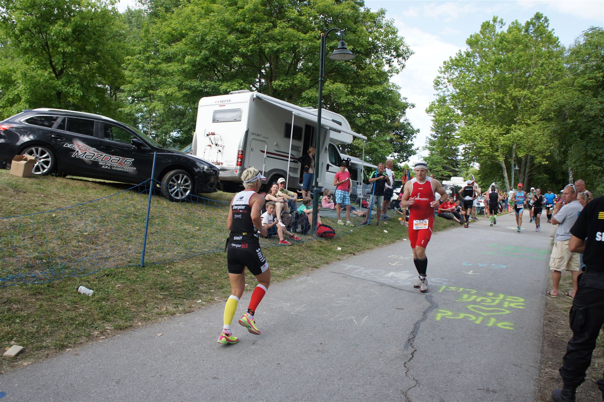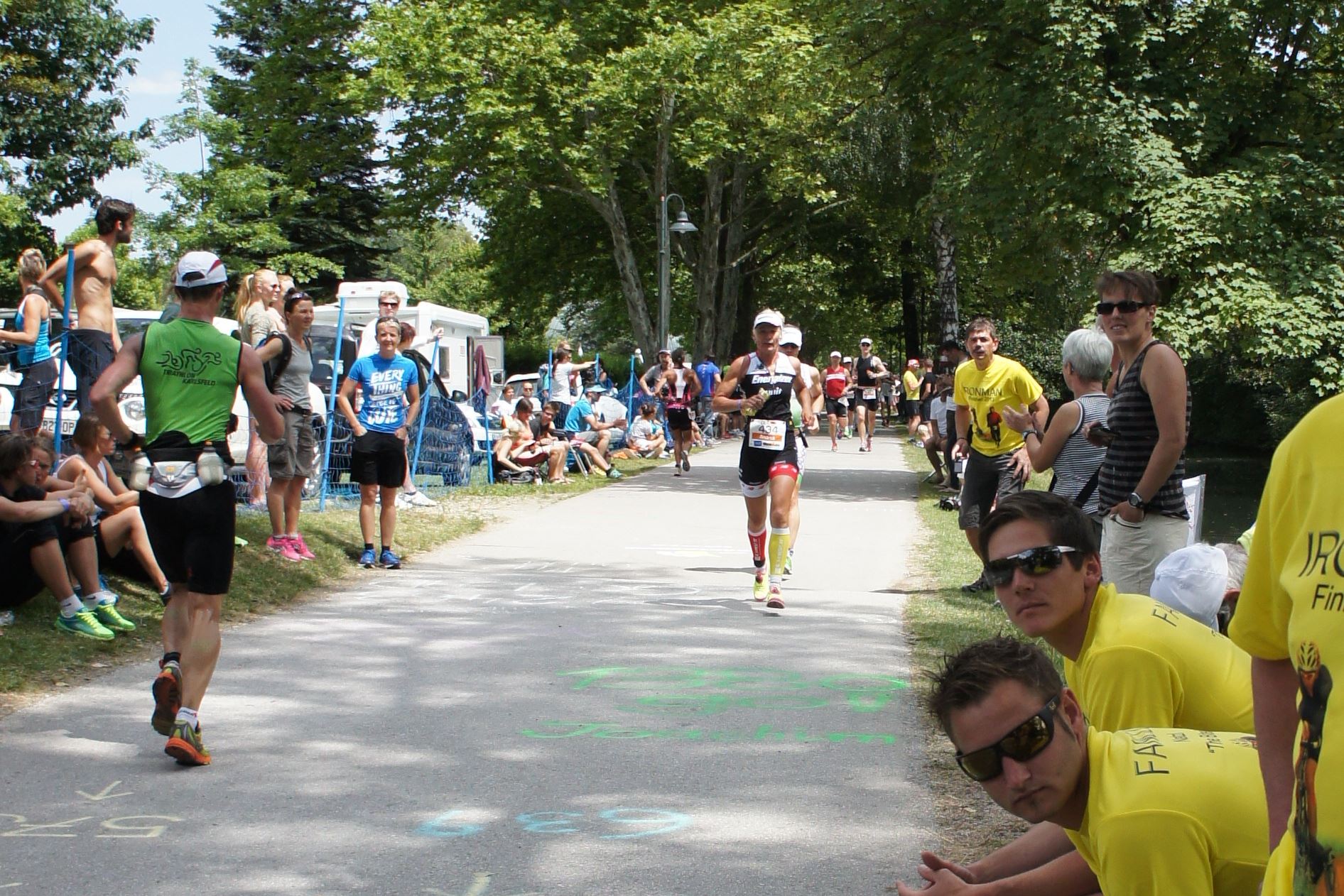 Das Wetter ist prima, die Temperatur liegt bei ca. 26 Grad im Schatten. Es werden 2 Runde á 21 km gelaufen. Von der Wechselzone geht es am Anfang entlang der Lende in Richtung Krumpendorf. In Krumpendorf läuft man eine kurze Strecke durchs Schwimmbad. Es ist schon etwas ungewöhnlich die Badegäste auf den Grünanlagen liegen zu sehen. Danach geht es entlang der Lende nach Klagenfurt Stadtmitte. Einmal um das Wahrzeichen, den Lindwurm herum und wieder zurück in Richtung Ziel. Die Strecke ist sehr abwechslungsreich, es stehen viele Freunde, Familie und Zuschauer an der Strecke. Aufgrund des Gegenverkehrs der anderen Läufer hat man immer etwas zu schauen. Das Anfeuern durch die Zuschauer puscht jeden Athleten. Die Schmerzen sind alle vergessen, man genießt die tolle Stimmung. Auf der 2. Runde habe ich leichte Probleme mit den Oberschenkeln und den Waden. Ich lasse mich davon jedoch nicht beirren, einfach nur weiterlaufen. Die Unterführung nach Klagenfurt sowie die Bordsteinkanten in der Stadtmitte bereiten mir etwas Probleme, aber egal, da macht man einfach etwas langsam.