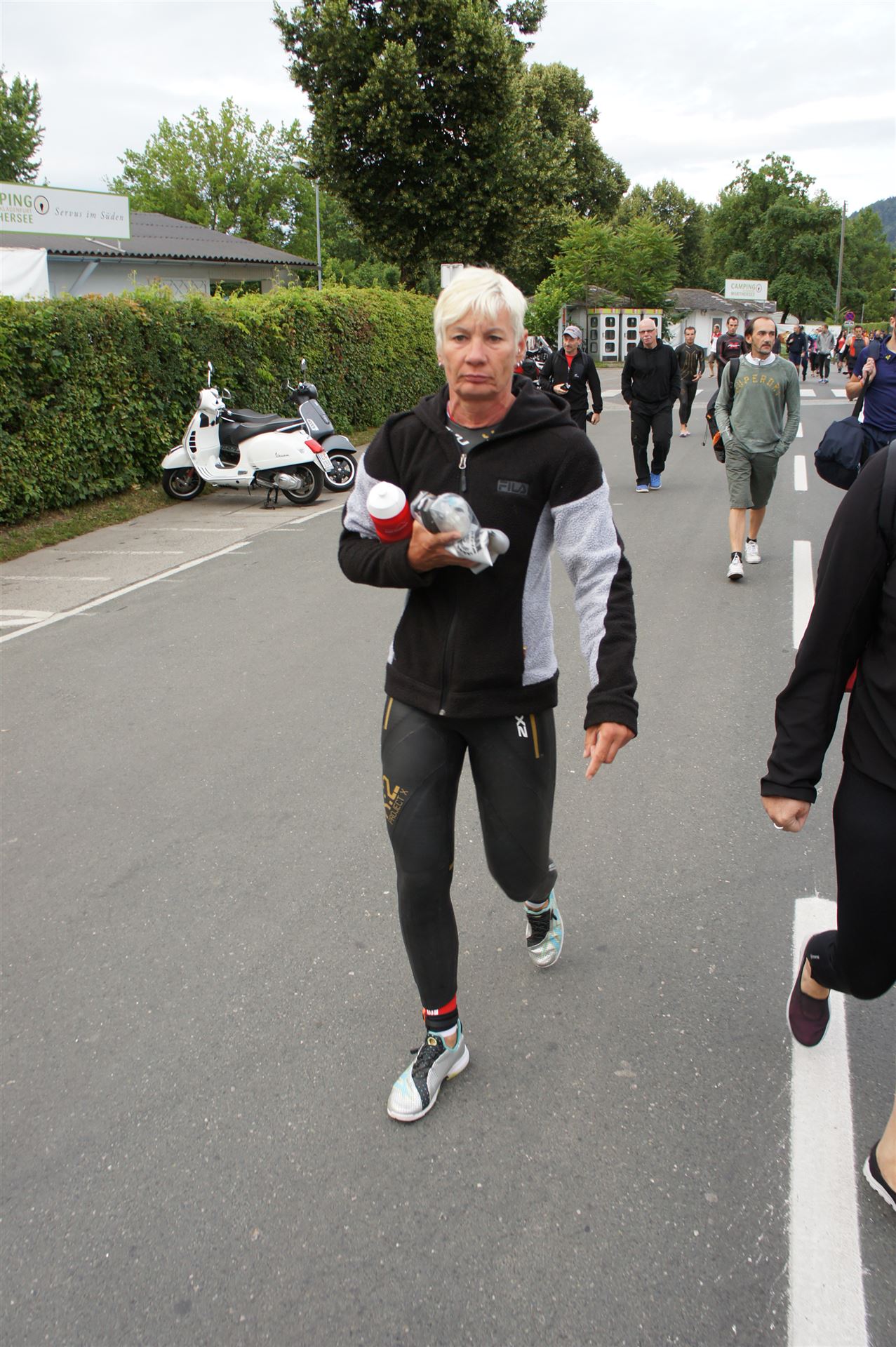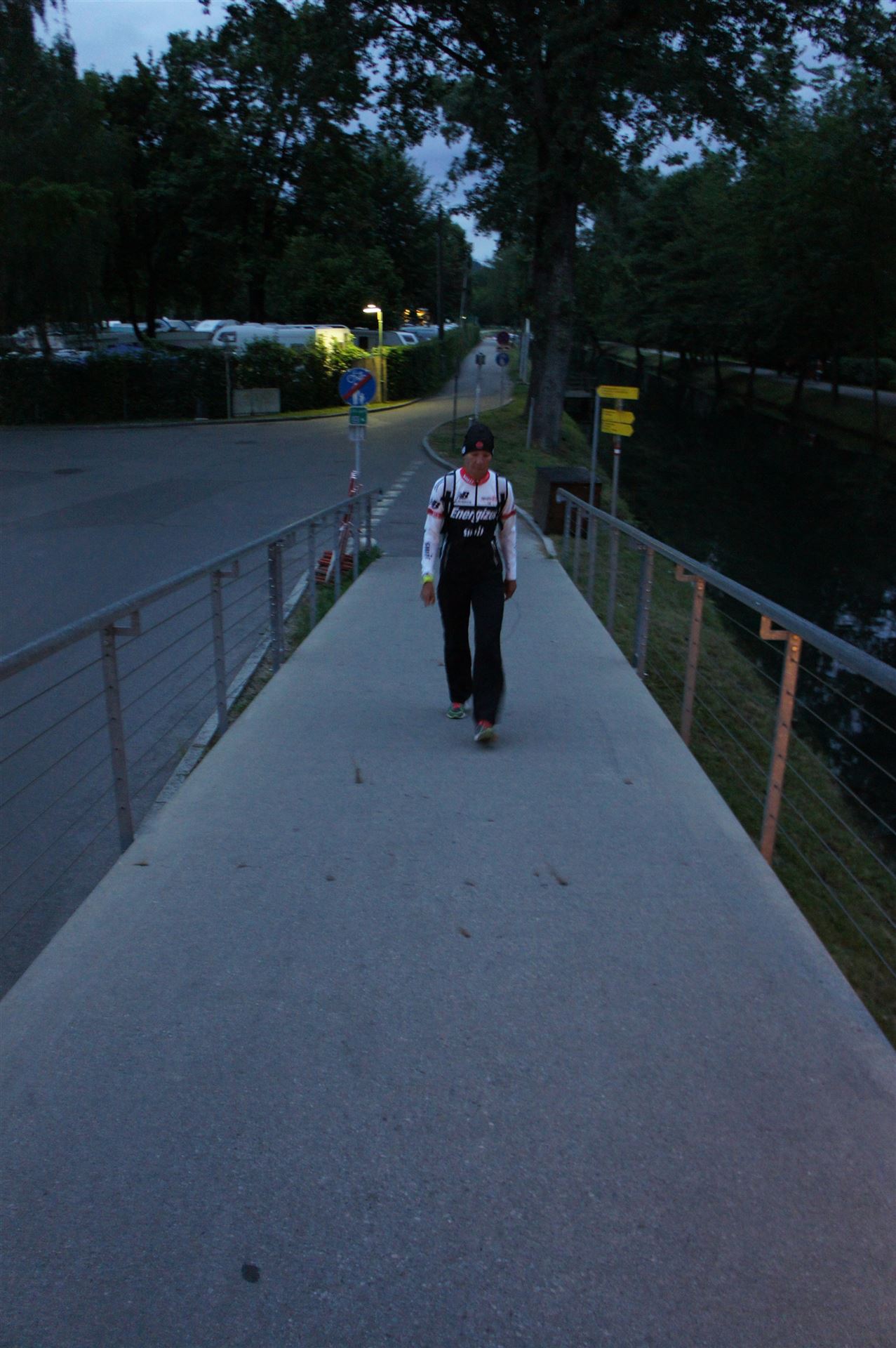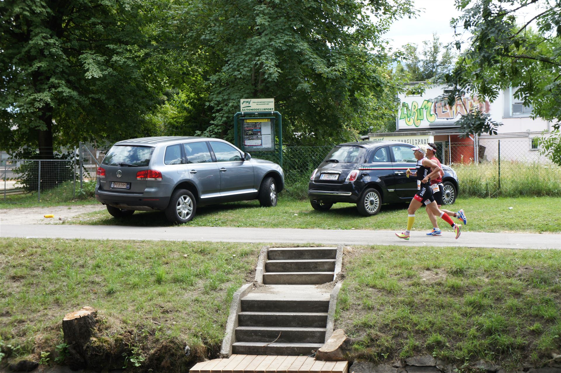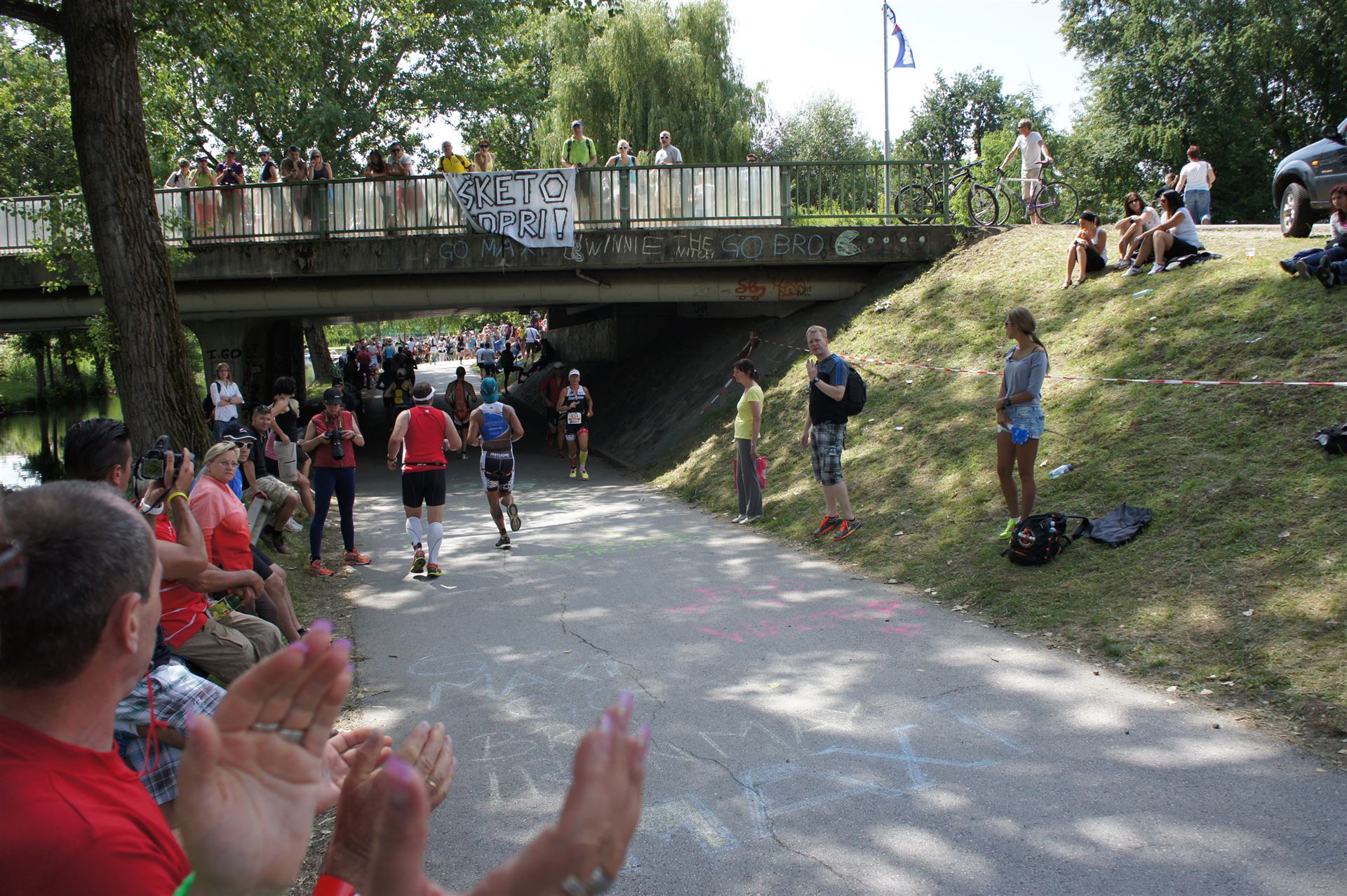Das Wetter ist prima, die Temperatur liegt bei ca. 26 Grad im Schatten. Es werden 2 Runde á 21 km gelaufen. Von der Wechselzone geht es am Anfang entlang der Lende in Richtung Krumpendorf. In Krumpendorf läuft man eine kurze Strecke durchs Schwimmbad. Es ist schon etwas ungewöhnlich die Badegäste auf den Grünanlagen liegen zu sehen. Danach geht es entlang der Lende nach Klagenfurt Stadtmitte. Einmal um das Wahrzeichen, den Lindwurm herum und wieder zurück in Richtung Ziel. Die Strecke ist sehr abwechslungsreich, es stehen viele Freunde, Familie und Zuschauer an der Strecke. Aufgrund des Gegenverkehrs der anderen Läufer hat man immer etwas zu schauen. Das Anfeuern durch die Zuschauer puscht jeden Athleten. Die Schmerzen sind alle vergessen, man genießt die tolle Stimmung. Auf der 2. Runde habe ich leichte Probleme mit den Oberschenkeln und den Waden. Ich lasse mich davon jedoch nicht beirren, einfach nur weiterlaufen. Die Unterführung nach Klagenfurt sowie die Bordsteinkanten in der Stadtmitte bereiten mir etwas Probleme, aber egal, da macht man einfach etwas langsam.