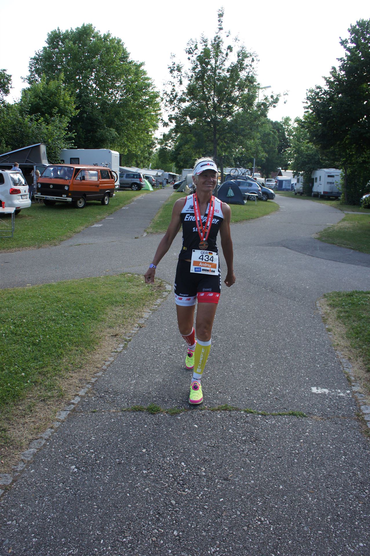 Ich bin geduscht, etwas essen kann ich an diesem Tag nichts mehr. Mein Rad sowie meine übrige Kleidung habe ich bereits aus der Wechselzone geholt. Es geht wieder zurück an die Finisherline. Die Stimmung ist gigantisch. Jeder einzelne Athlet wird von den Moderatoren und vom Publikum begrüßt. Der Zieleinlauf ist bis 00:00 Uhr geöffnet, danach gibt es noch ein Feuerwerk.