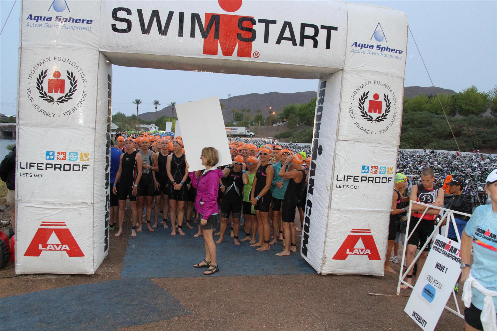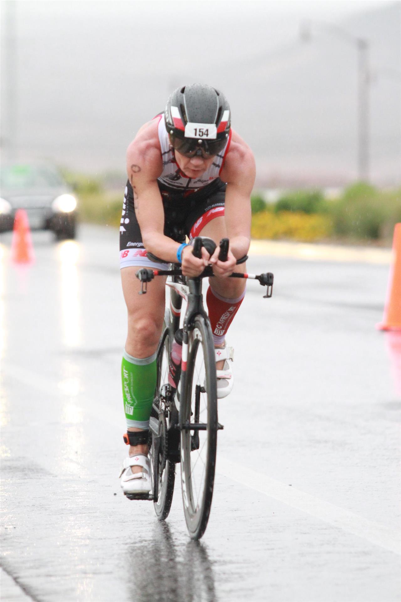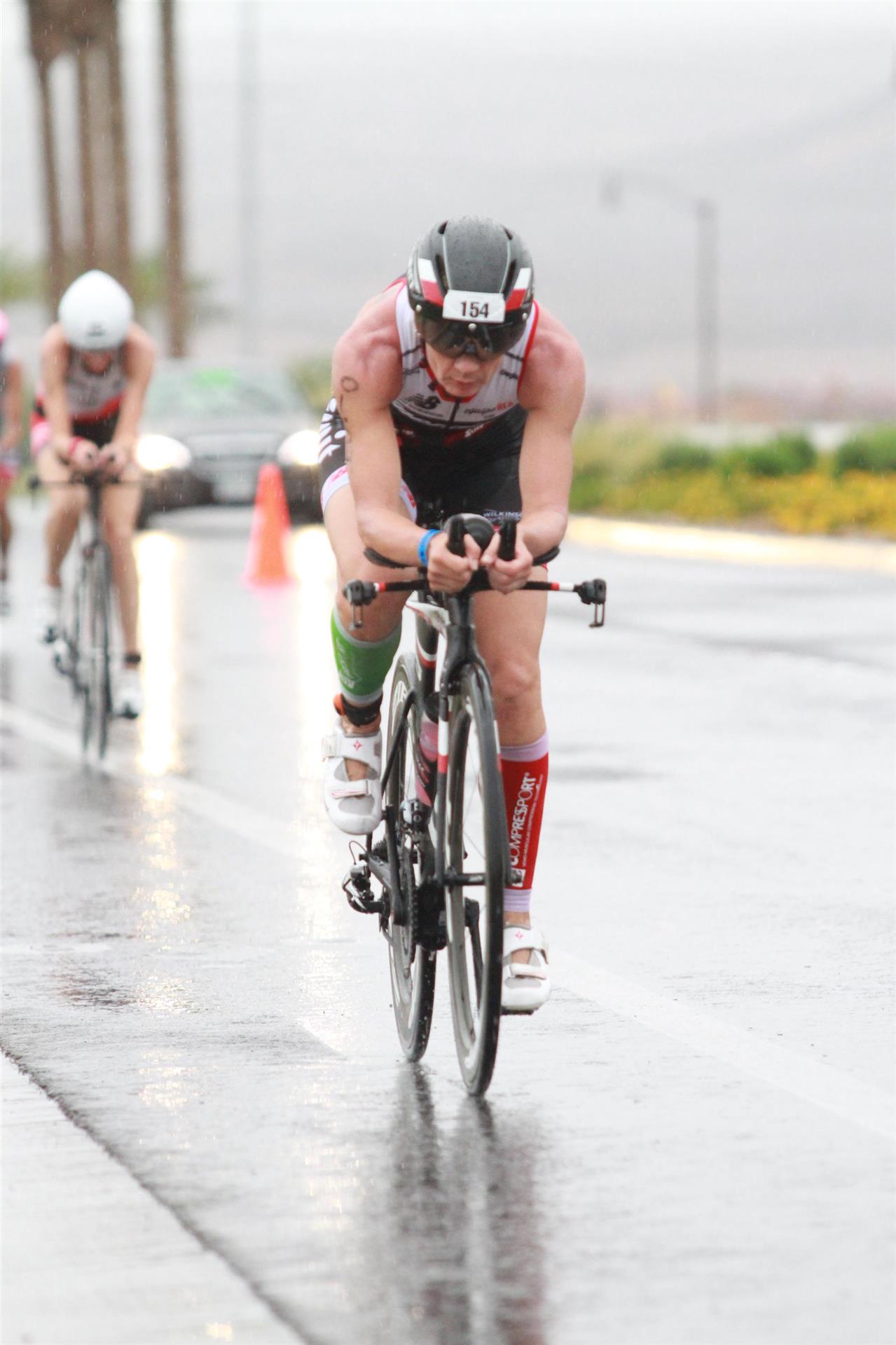 Heute ist Renntag. Um 3.30 Uhr klingelt der Wecker, mörderische Zeit zum aufstehen. Nachdem ich einigermaßen wach bin gibt es eine Tasse Kaffee sowie Weißbrot mit Honig. Normalerweise kann ich um diese Zeit noch nichts essen, aber das muss nun mal sein. Um 4:30 Uhr öffnet die Wechselzone. Draußen regnet es in strömen, das darf doch nicht wahr sein. Da reist man viele Kilometer nach Las Vegas mit einer Durchschnittstemperatur von über 30 Grad Celsius und 10 Regentagen im Jahr und was ist am Wettkampftag - es regnet in strömen. Glücklicherweise liegt unser Hotel direkt am Start, der Weg bis zur Wechselzone dauert circa 2 Minuten. Luft geprüft, Getränke ausgefüllt sowie Verpflegung gepackt. Gott sei Dank habe ich eine Taschenlampe dabei, um diese Zeit ist es noch sehr dunkel. Bis alles erledigt ist bin ich klatsch nass. Da ich noch etwas Zeit habe gehe ich noch einmal ins Apartment. Da der See sehr warm ist, ca. 30 Grad, ist Neoprenverbot.