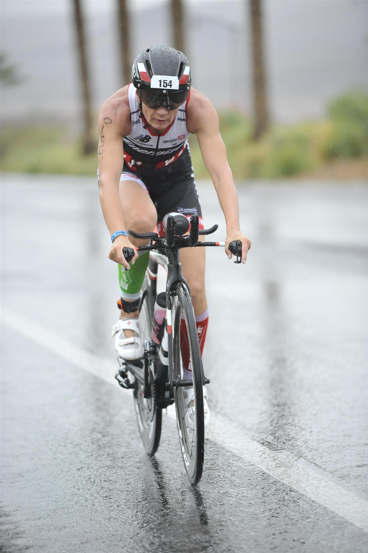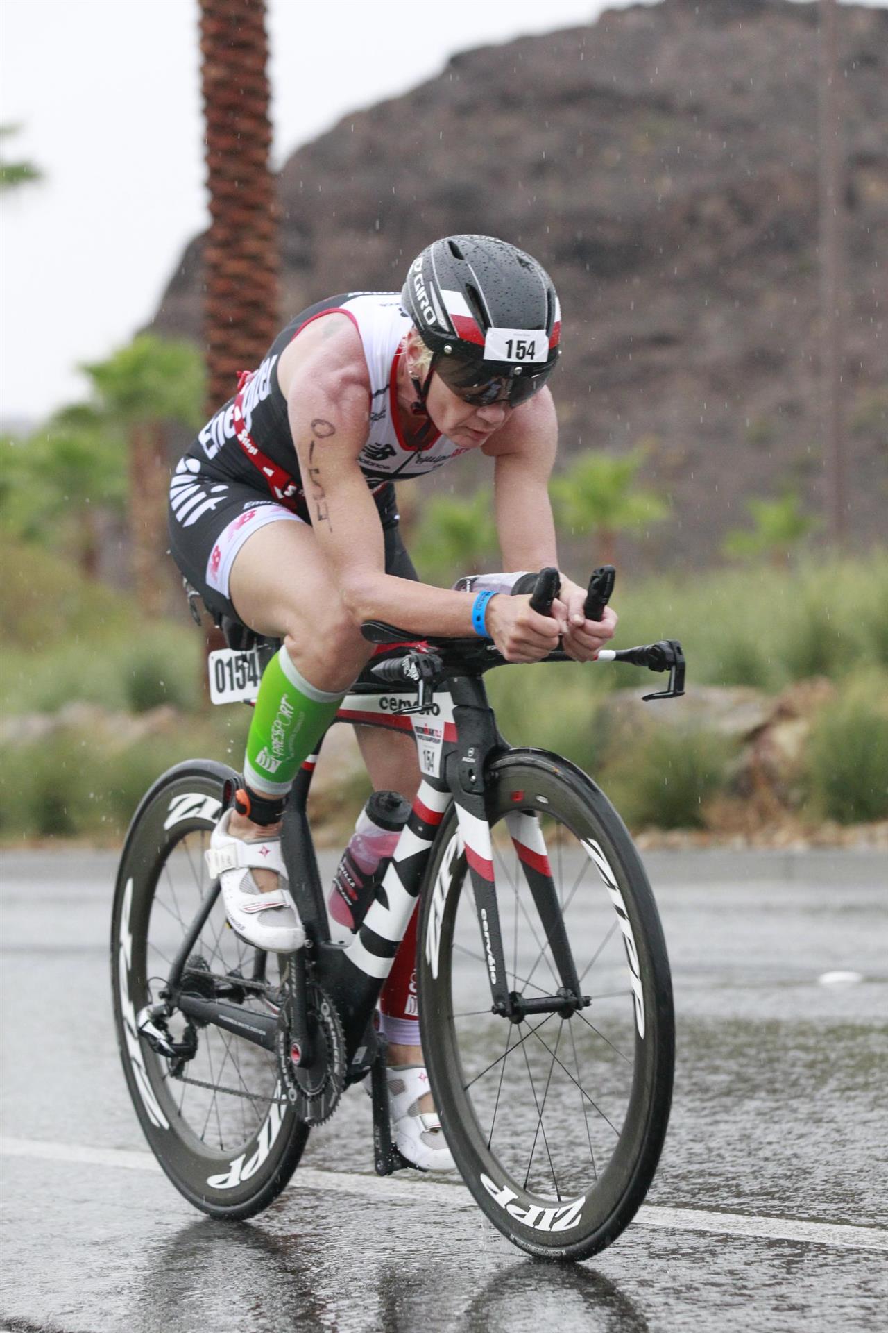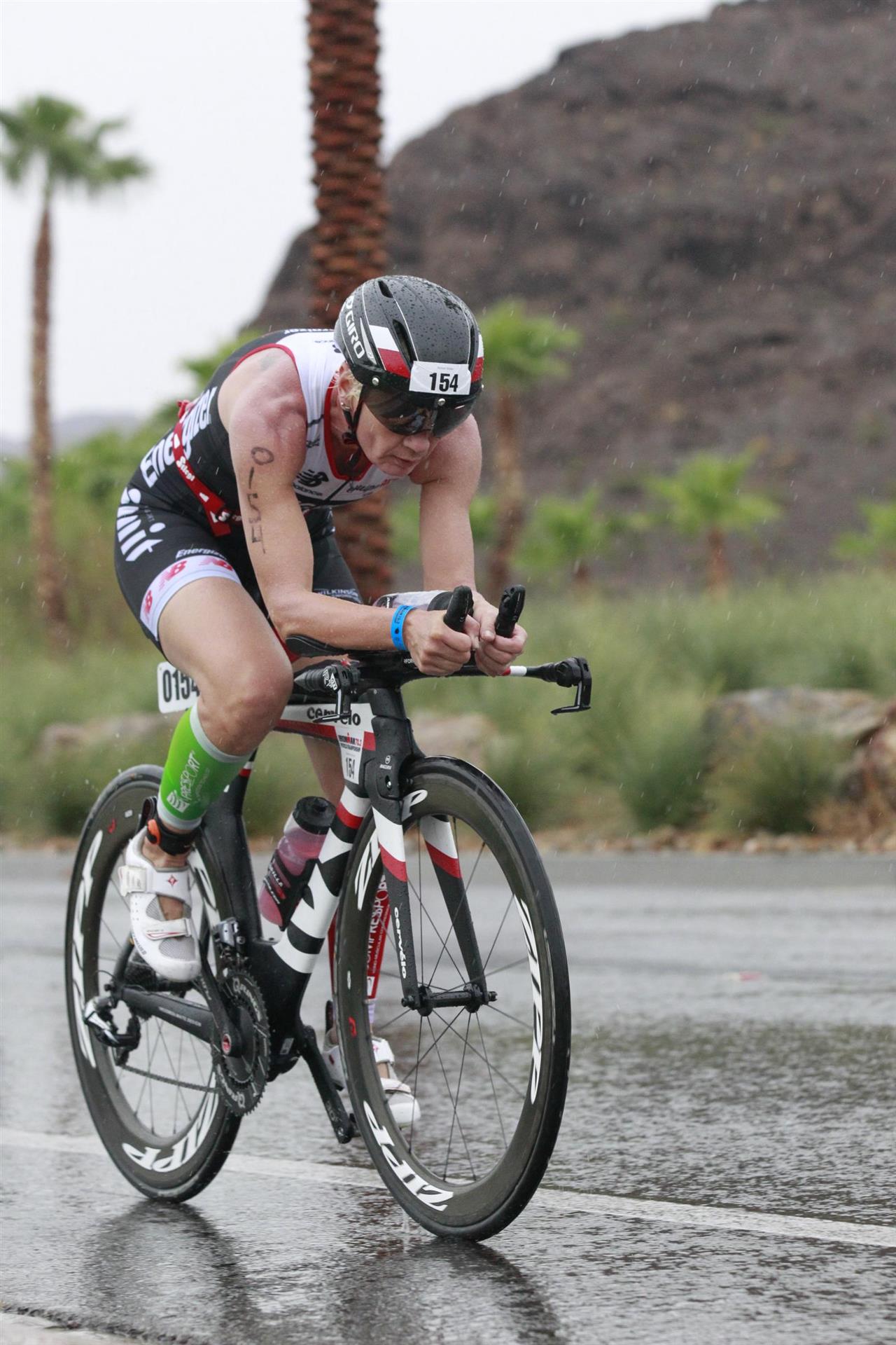 Heute ist Renntag. Um 3.30 Uhr klingelt der Wecker, mörderische Zeit zum aufstehen. Nachdem ich einigermaßen wach bin gibt es eine Tasse Kaffee sowie Weißbrot mit Honig. Normalerweise kann ich um diese Zeit noch nichts essen, aber das muss nun mal sein. Um 4:30 Uhr öffnet die Wechselzone. Draußen regnet es in strömen, das darf doch nicht wahr sein. Da reist man viele Kilometer nach Las Vegas mit einer Durchschnittstemperatur von über 30 Grad Celsius und 10 Regentagen im Jahr und was ist am Wettkampftag - es regnet in strömen. Glücklicherweise liegt unser Hotel direkt am Start, der Weg bis zur Wechselzone dauert circa 2 Minuten. Luft geprüft, Getränke ausgefüllt sowie Verpflegung gepackt. Gott sei Dank habe ich eine Taschenlampe dabei, um diese Zeit ist es noch sehr dunkel. Bis alles erledigt ist bin ich klatsch nass. Da ich noch etwas Zeit habe gehe ich noch einmal ins Apartment. Da der See sehr warm ist, ca. 30 Grad, ist Neoprenverbot.