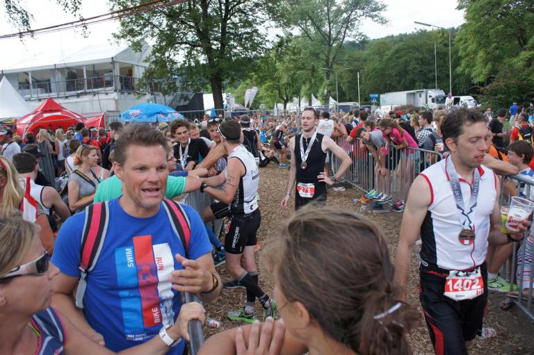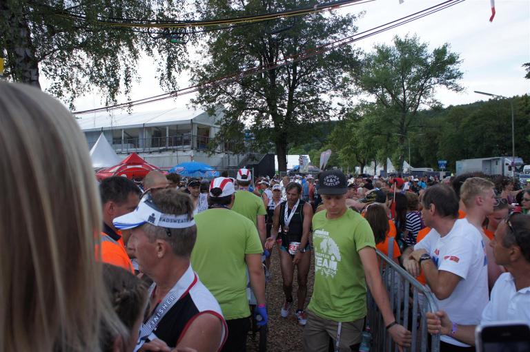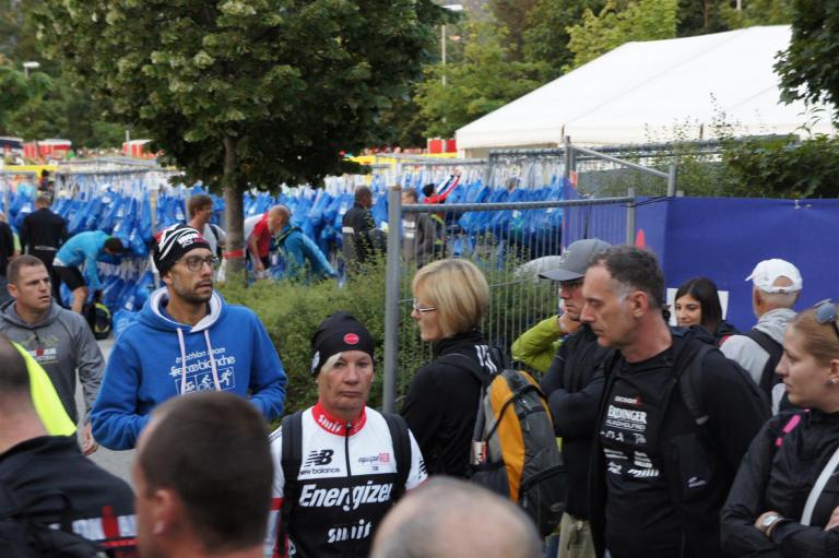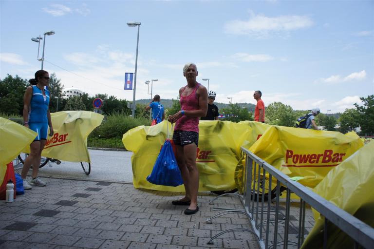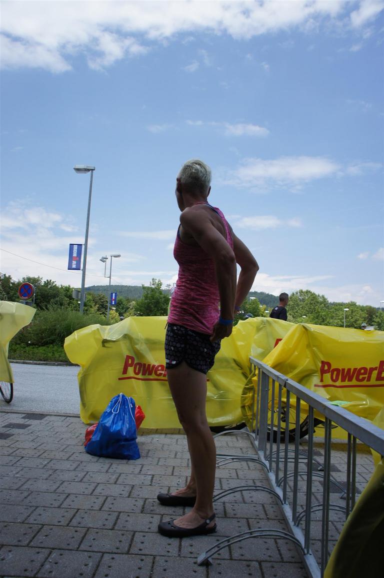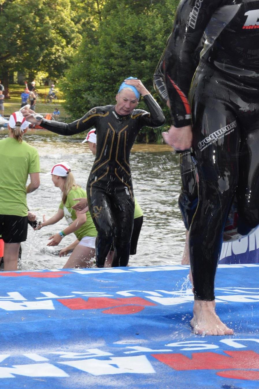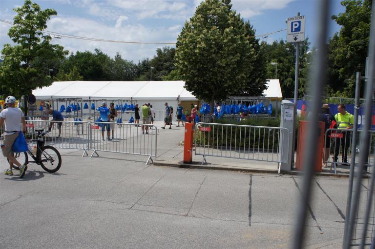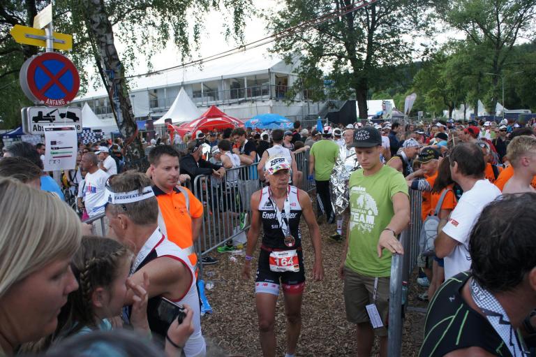 Nach einer Schwimmzeit von 1 Stunde und 11 Minuten verlasse ich das Wasser. Ich bin zufrieden mit meiner Zeit. Der Weg vom Schwimmausstieg bis in die Wechselzone ist relativ lange. Man hat ausreichend Zeit den Neoprenanzug etwas auszuziehen.