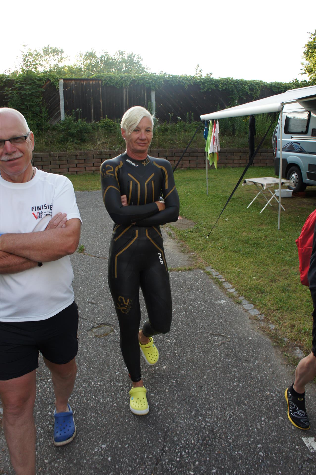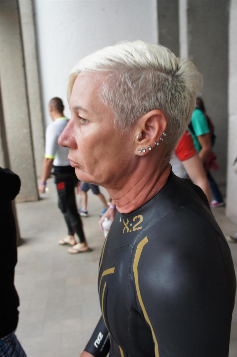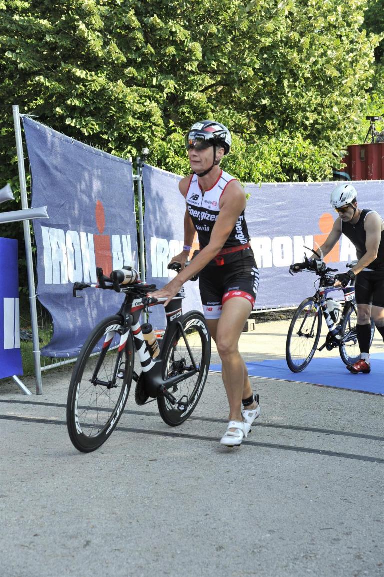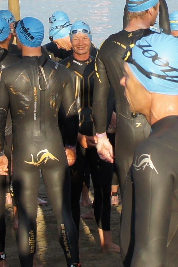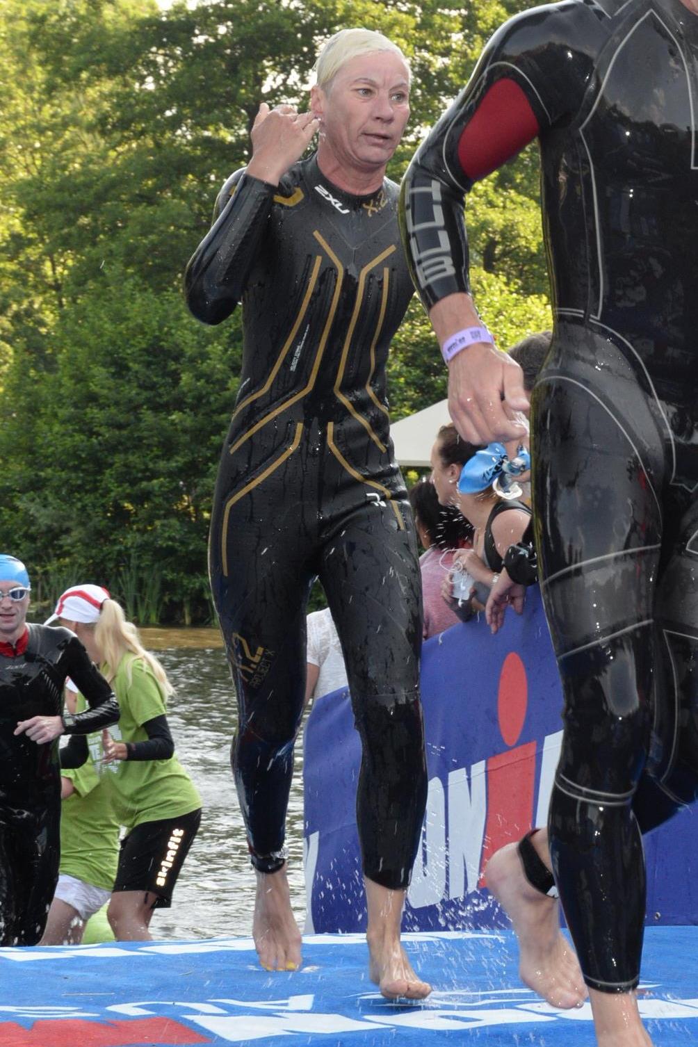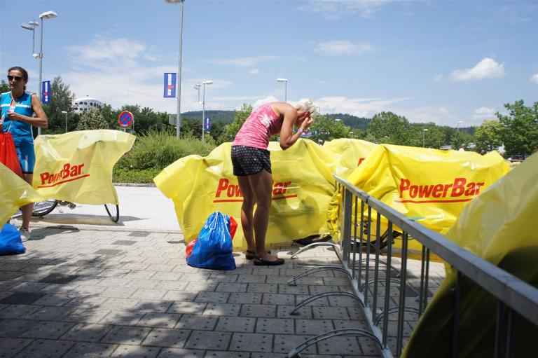 Nach einer Schwimmzeit von 1 Stunde und 11 Minuten verlasse ich das Wasser. Ich bin zufrieden mit meiner Zeit. Der Weg vom Schwimmausstieg bis in die Wechselzone ist relativ lange. Man hat ausreichend Zeit den Neoprenanzug etwas auszuziehen.