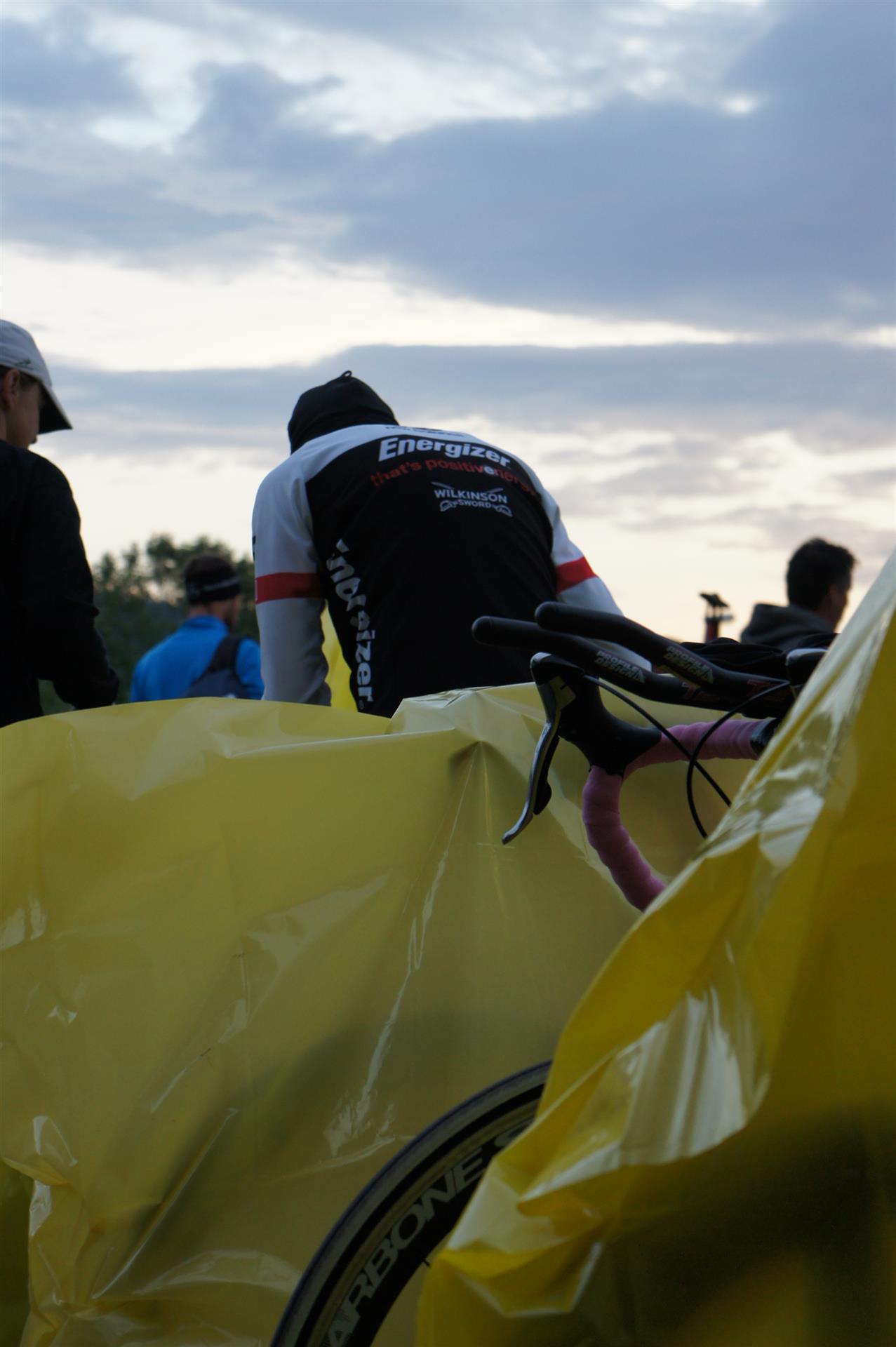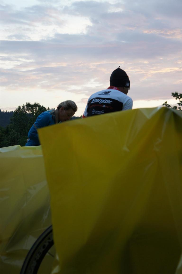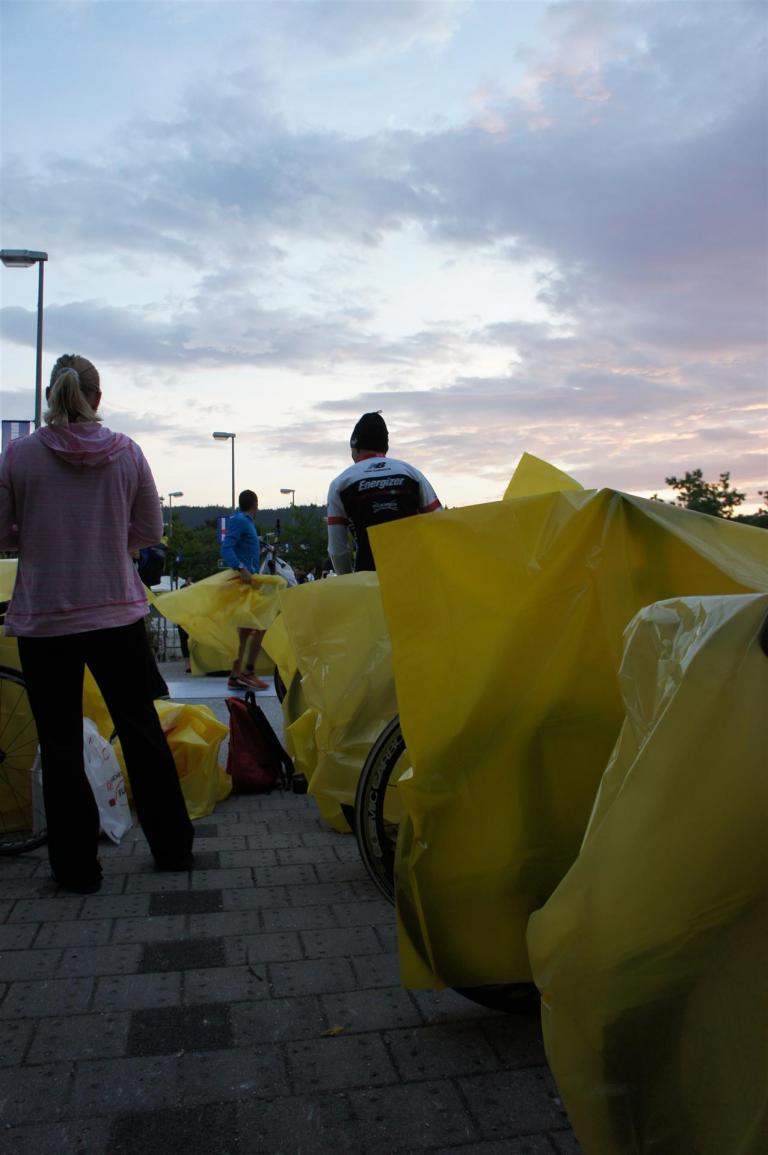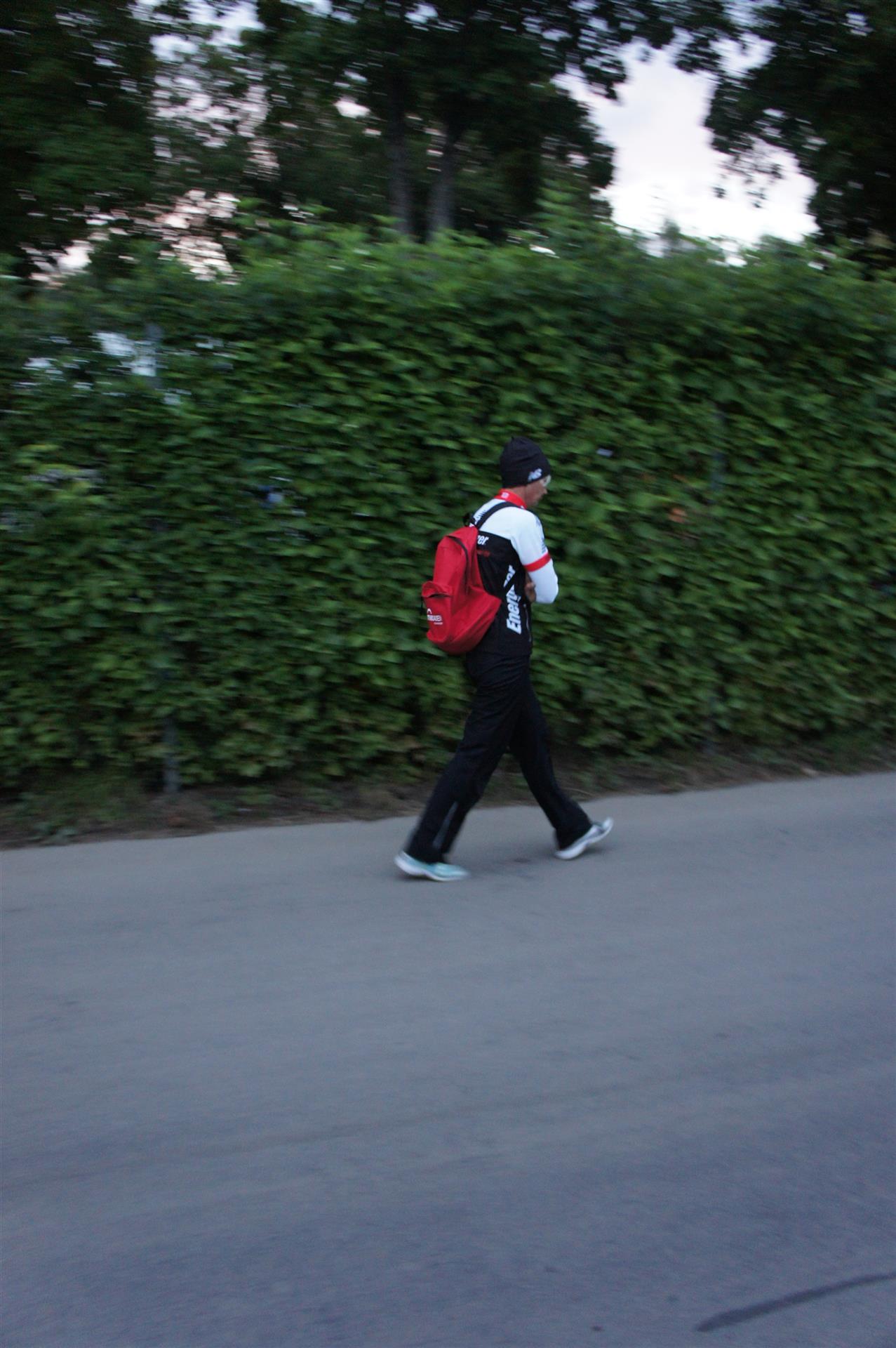 Nach einer Schwimmzeit von 1 Stunde und 11 Minuten verlasse ich das Wasser. Ich bin zufrieden mit meiner Zeit. Der Weg vom Schwimmausstieg bis in die Wechselzone ist relativ lange. Man hat ausreichend Zeit den Neoprenanzug etwas auszuziehen.
