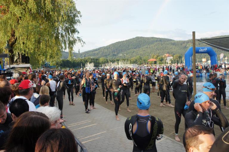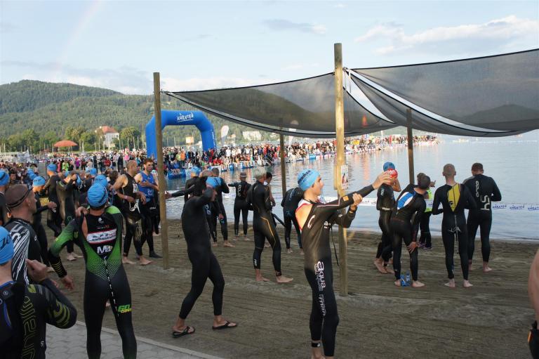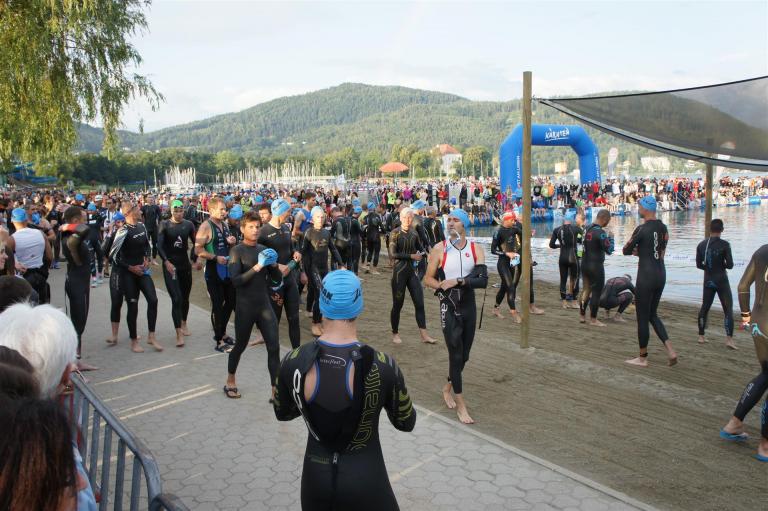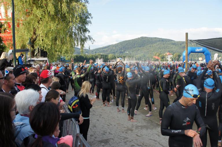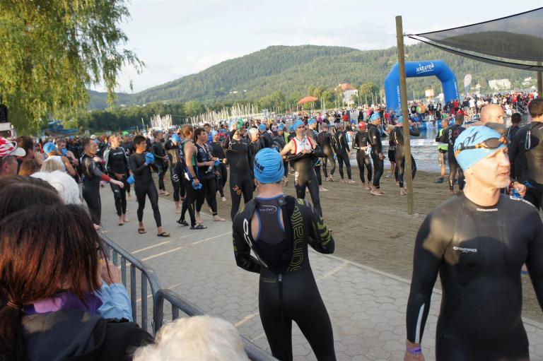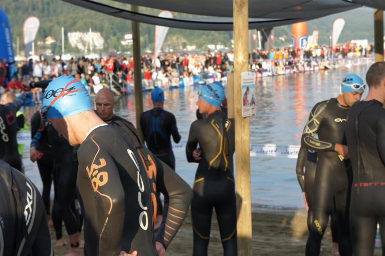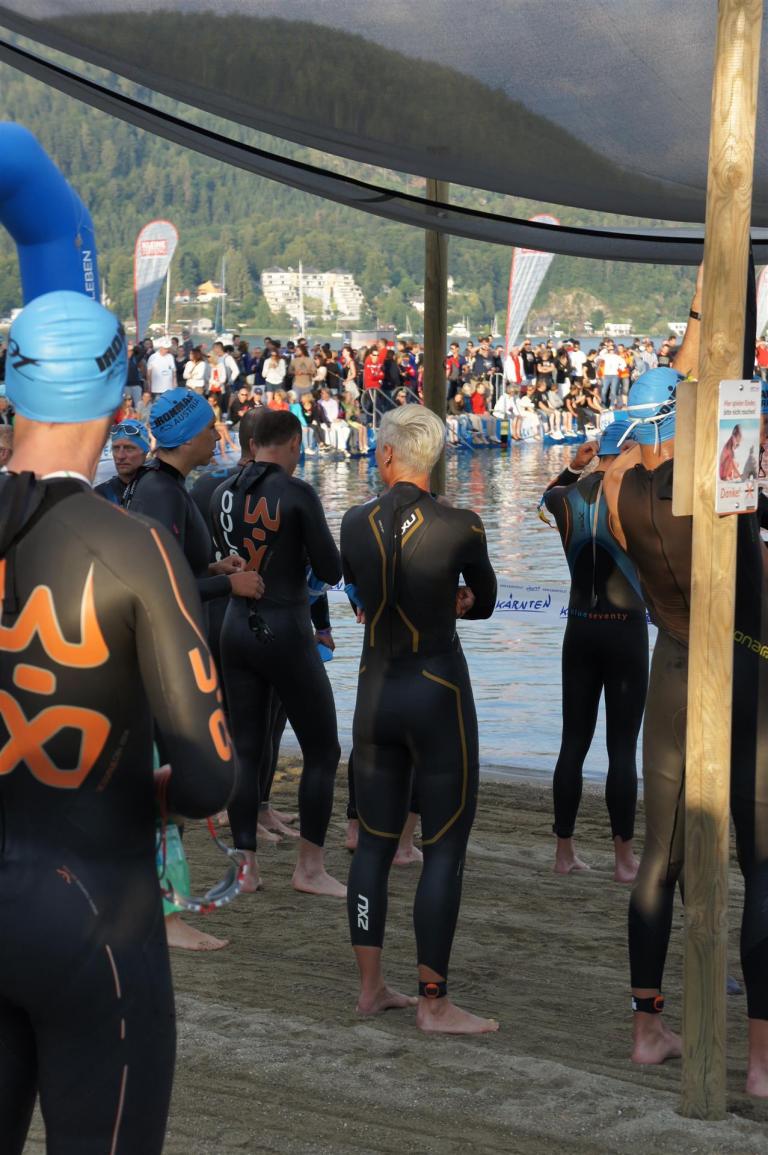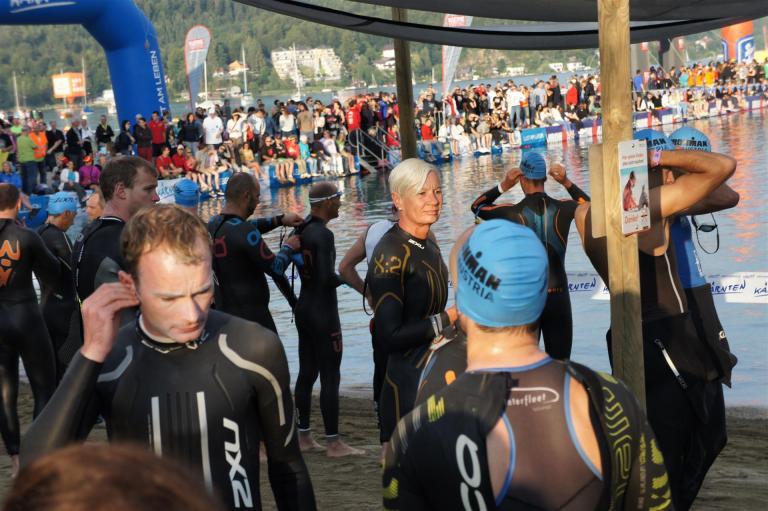Obwohl ich lediglich eine mittelmäßige Schwimmerin bin macht mir das Schwimmen Spaß. Ich versuche meinen Rhythmus zu finden und gehe möglichst allen Konfrontationen aus dem Weg. Das Schwimmen im Wörthersee ist schon eine tolle Sache. Das Wasser ist super klar, die Strecke gut gekennzeichnet. Lediglich die letzten 1.000 Meter im Lendkanal sind etwas stressig. Wenn sich der ganze Pulk in den lediglich 10-12 Meter breiten Kanal zwängt. Da gibt es auf den ersten Metern ein ganz schönes Gedränge. Man wird jedoch durch die vielen Zuschauer am Rande des Kanals entschädigt. Die Stimmung ist gewaltig, der Krach ohrenbetäubend.