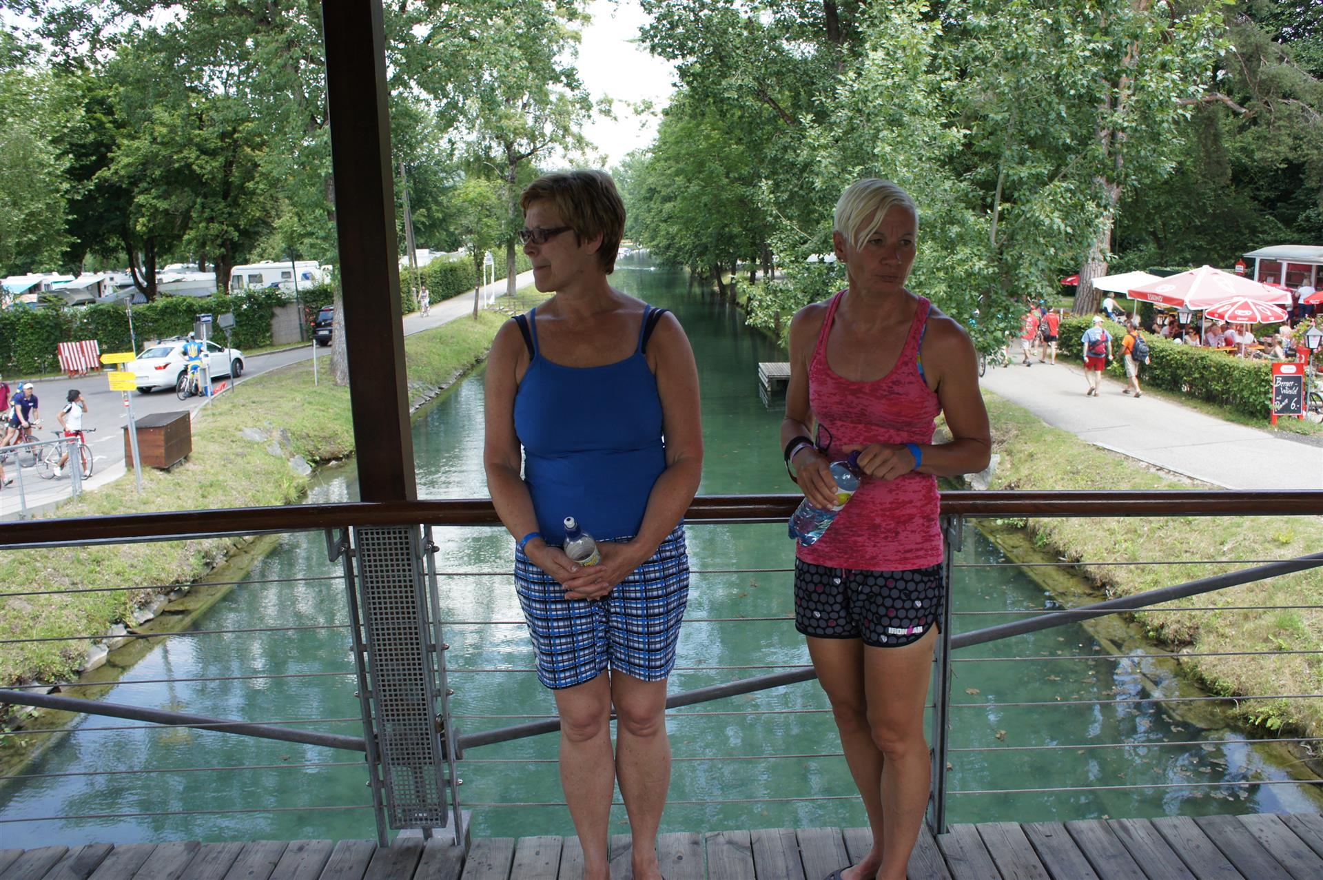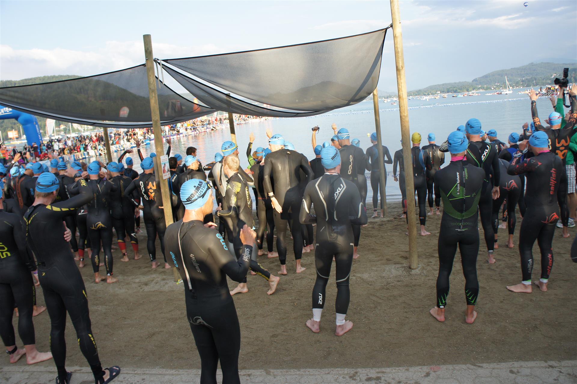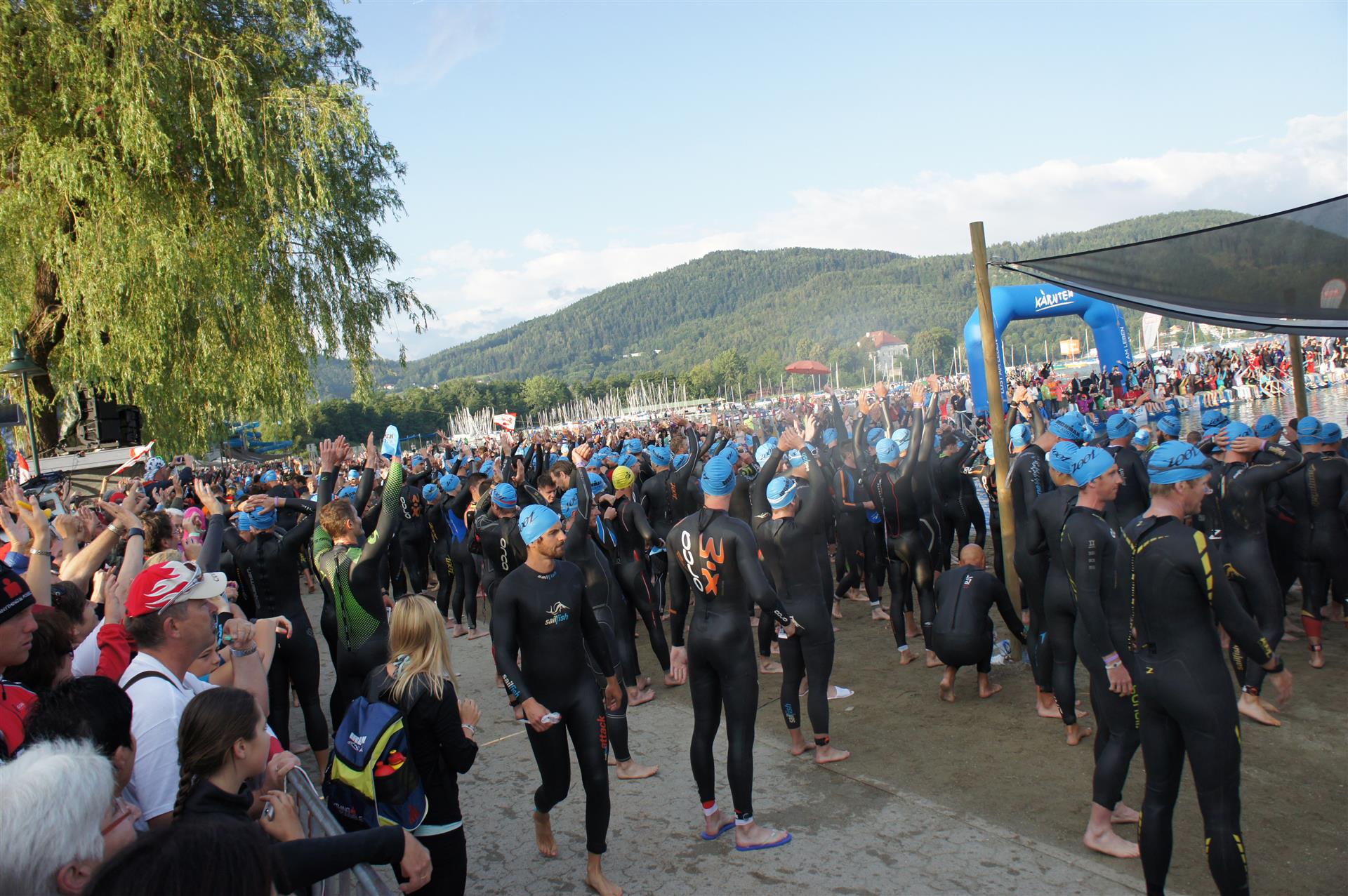 Obwohl ich lediglich eine mittelmäßige Schwimmerin bin macht mir das Schwimmen Spaß. Ich versuche meinen Rhythmus zu finden und gehe möglichst allen Konfrontationen aus dem Weg. Das Schwimmen im Wörthersee ist schon eine tolle Sache. Das Wasser ist super klar, die Strecke gut gekennzeichnet. Lediglich die letzten 1.000 Meter im Lendkanal sind etwas stressig. Wenn sich der ganze Pulk in den lediglich 10-12 Meter breiten Kanal zwängt. Da gibt es auf den ersten Metern ein ganz schönes Gedränge. Man wird jedoch durch die vielen Zuschauer am Rande des Kanals entschädigt. Die Stimmung ist gewaltig, der Krach ohrenbetäubend.