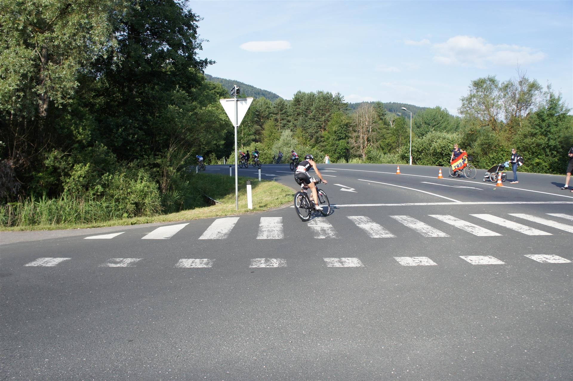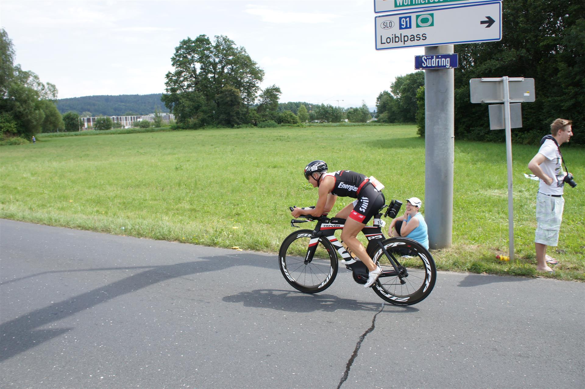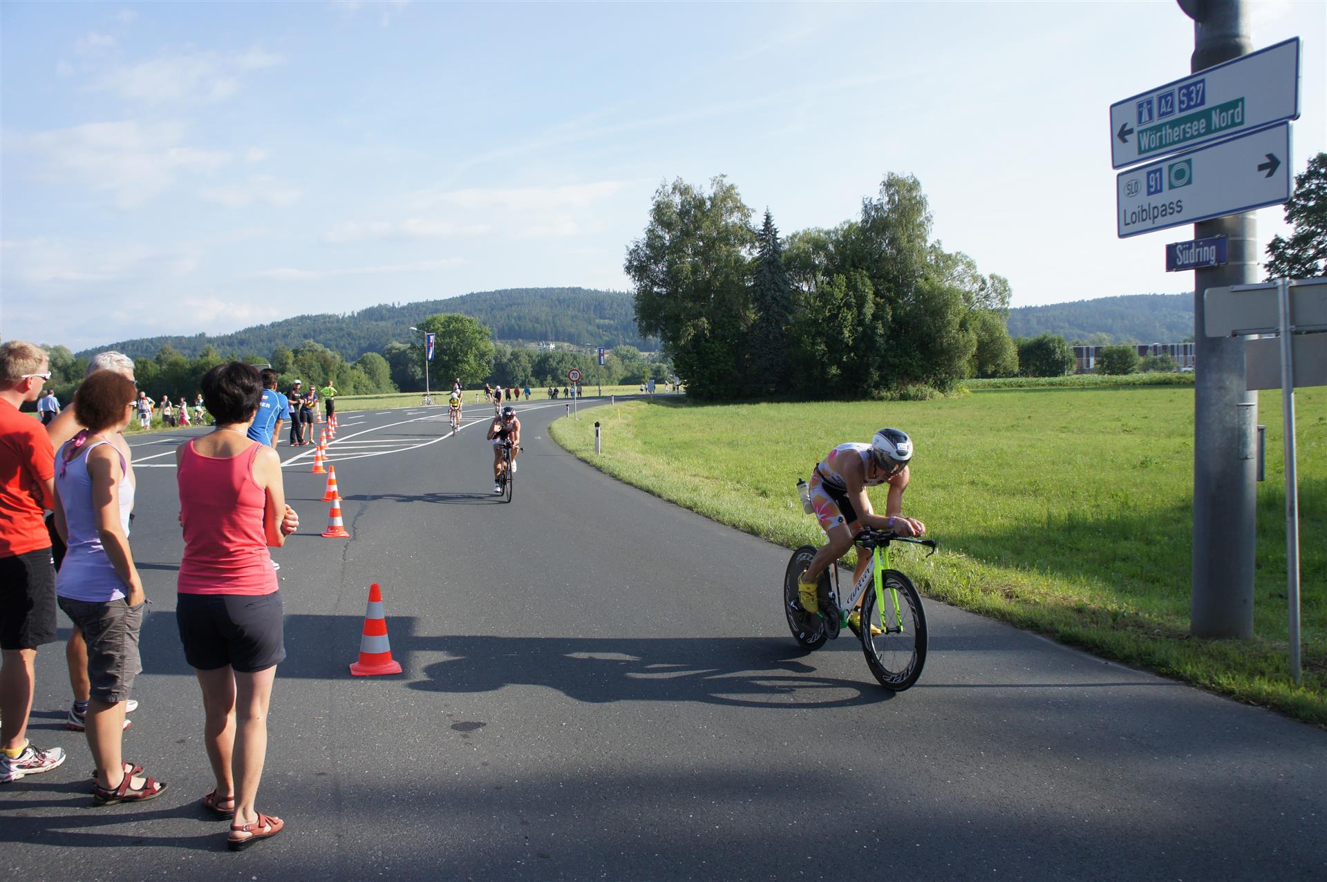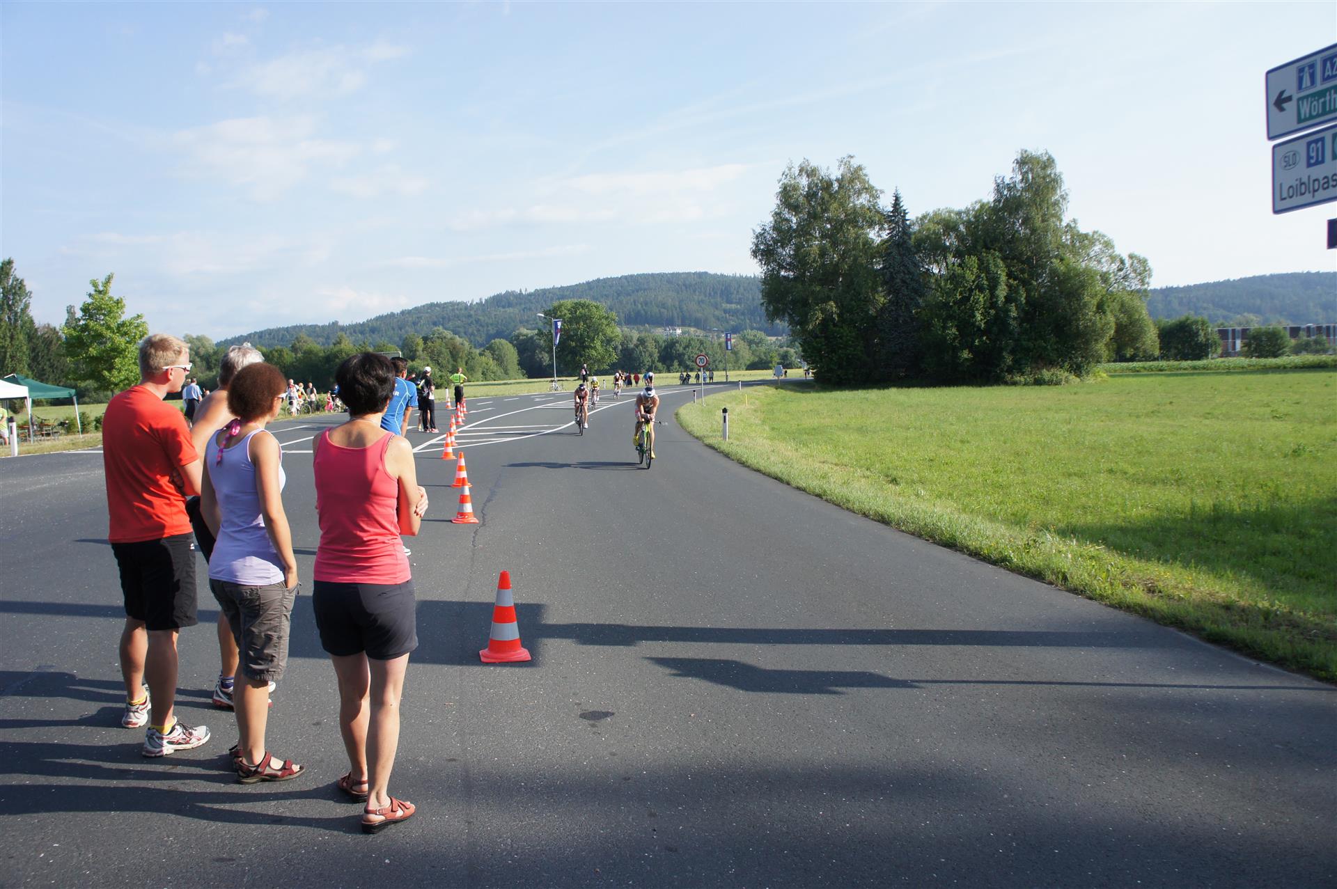 Am Faaker See gibt es dann den ersten richtigen Anstieg. Rechts und links entlang der Strecke haben sich viele Zuschauer versammelt. Allein durch das Anfeuern bewältigt man den Anstieg ohne Probleme. Der Tacho zeigt mitunter eine zweistellige Steigung an. Danach geht es flach weiter, dieses Stück mag ich nicht so gerne, da man oft Gegenwind hat. Aber egal, den Wind haben alle Athleten.