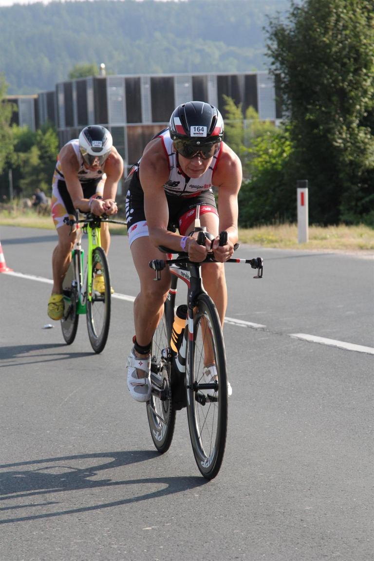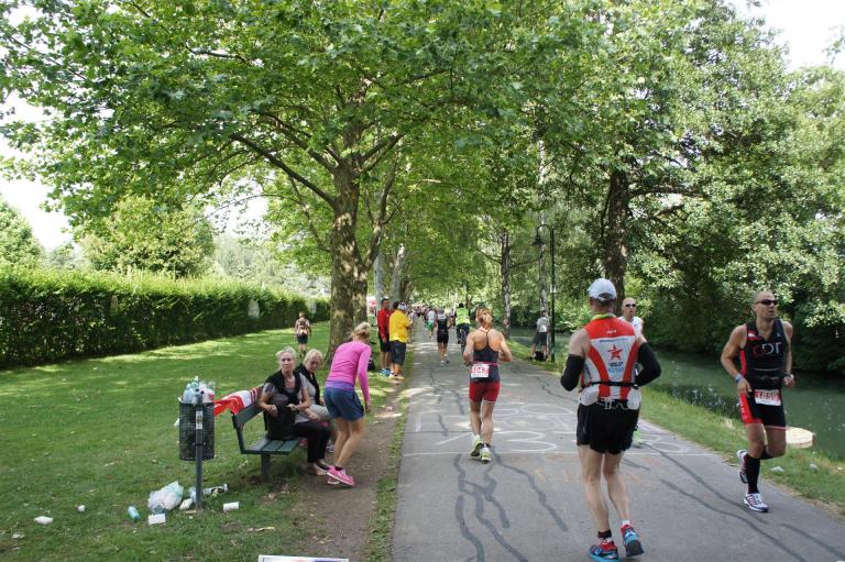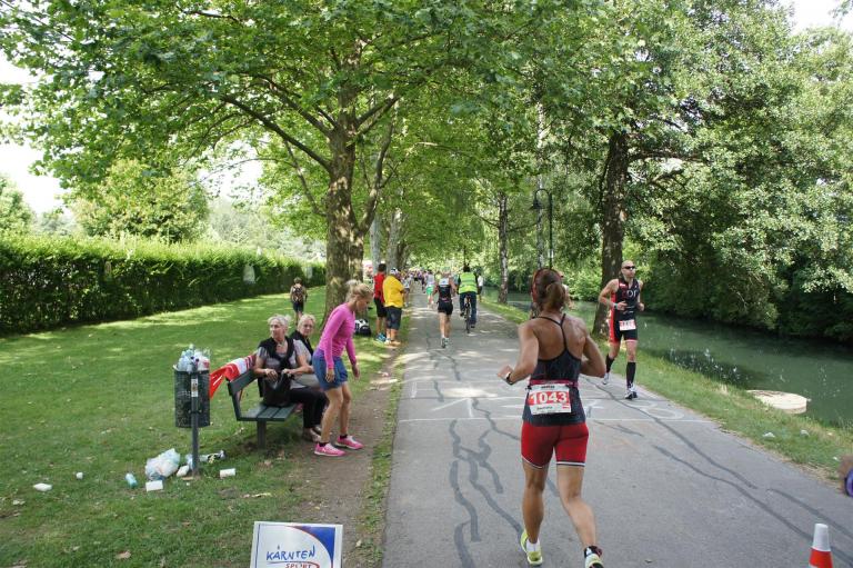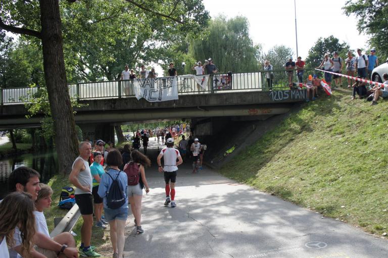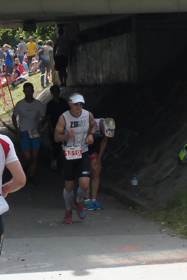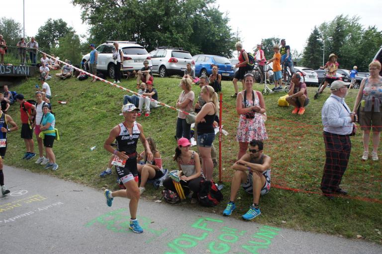 Als nächste Etappe steht dann der Anstieg zum Rupertiberg an. Der Anstieg ist etwas 2.400 Meter lang bei einer Steigung von bis zu 16 %. Auch hier haben sich sehr viele Zuschauer versammelt, das Anfeuern spornt die Athleten zu Höchstleistung an. Die letzten Kilometer der ersten Runde geht es dann überwiegend nur noch nach unten. Auf der zweiten Radrunde regnet es leider etwas, aber egal, da fährt man einfach etwas vorsichtiger. Nach 5:50 Stunden steige ich vom Rad und ziehe meine Laufschuhe an.