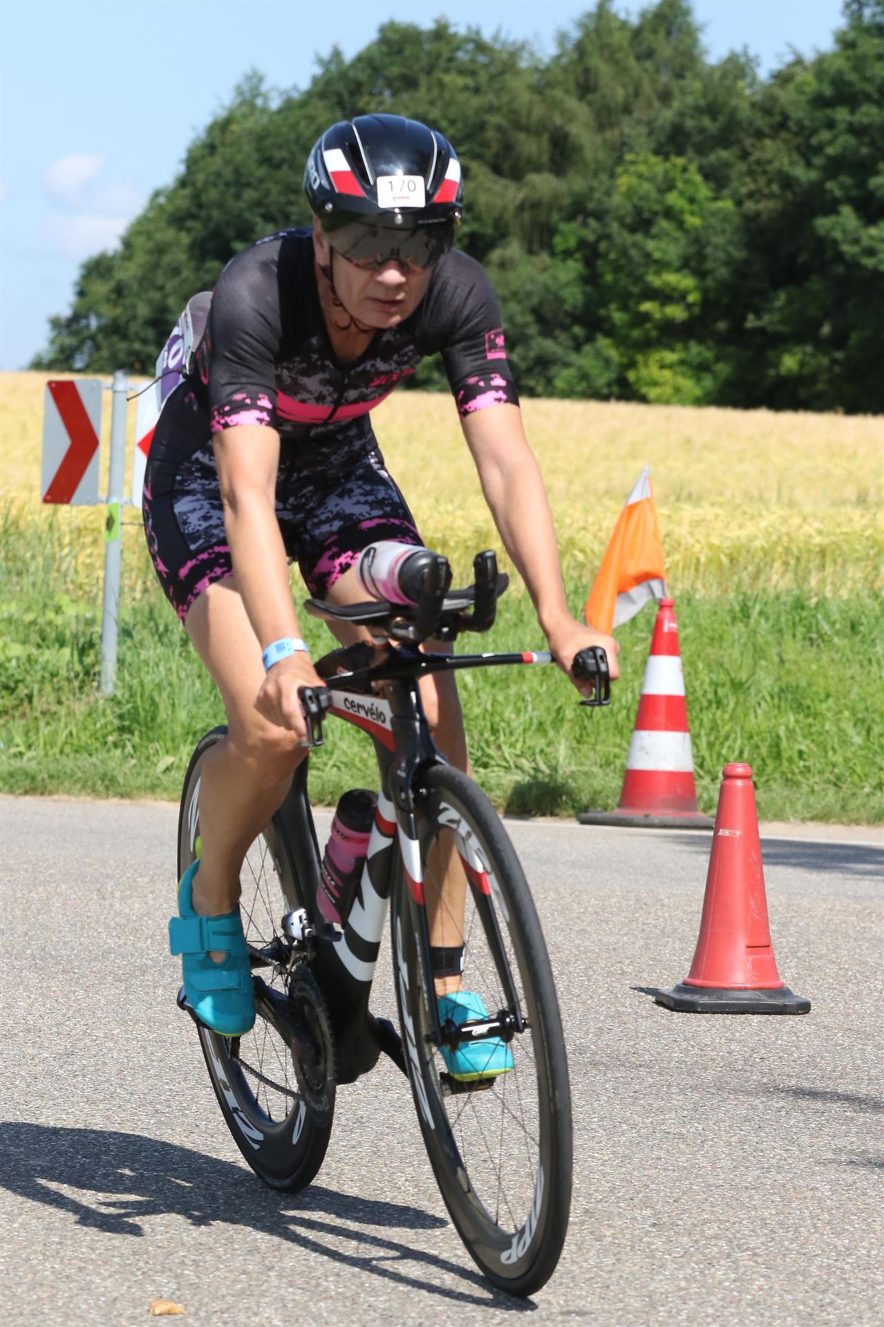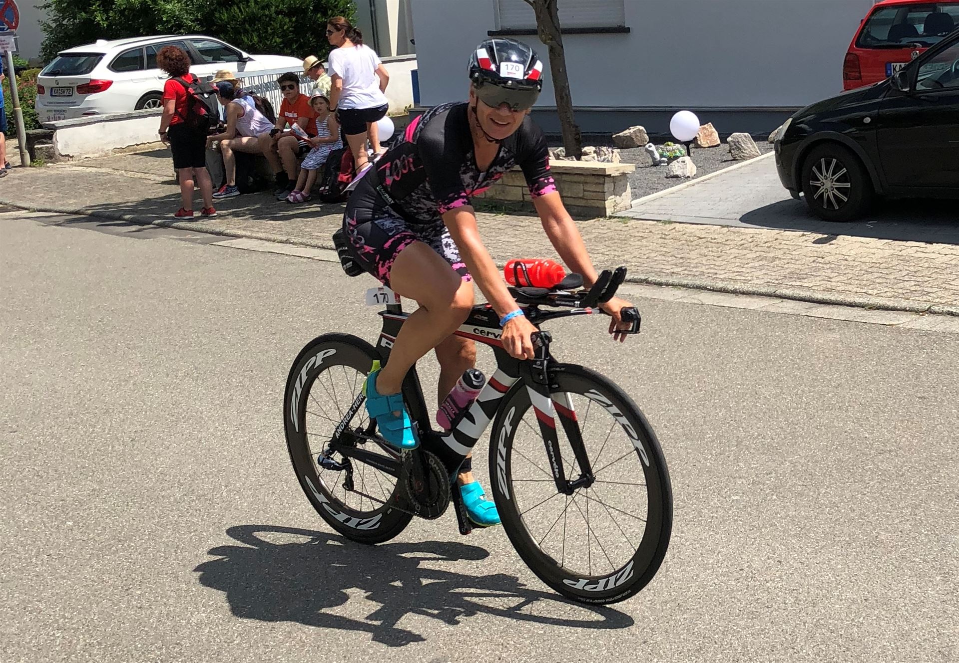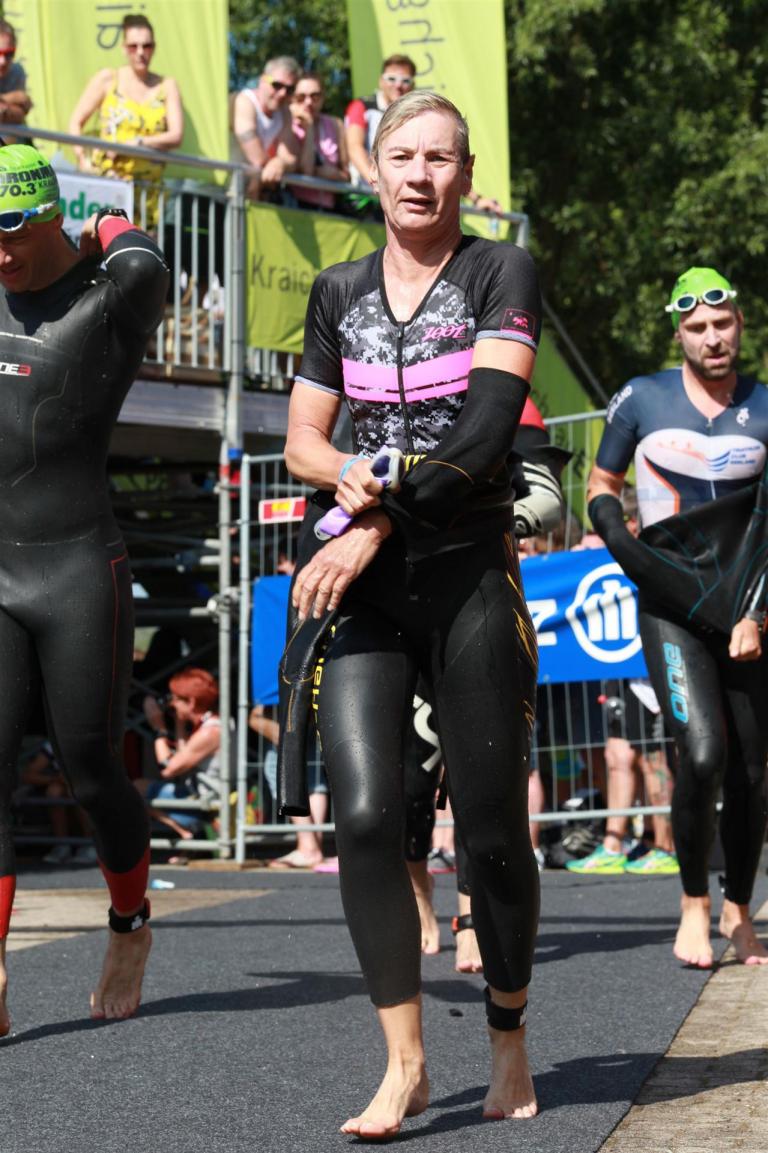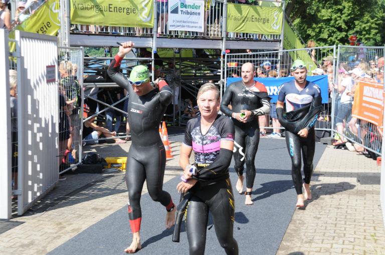 Geschwommen wurde im Hardtsee in Ubstadt-Weiher. Bei einer Wassertemperatur von 23,7 Grad durften wir mit Neo schwimmen, für die Profis galt Neoverbot. Mit einer Schwimmzeit von 36:25 ging ich als 3. Frau in meiner AK aus dem Wasser.