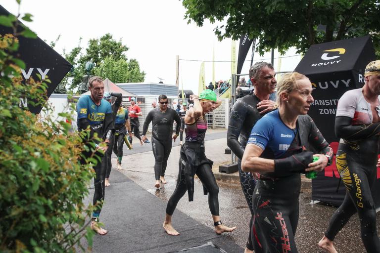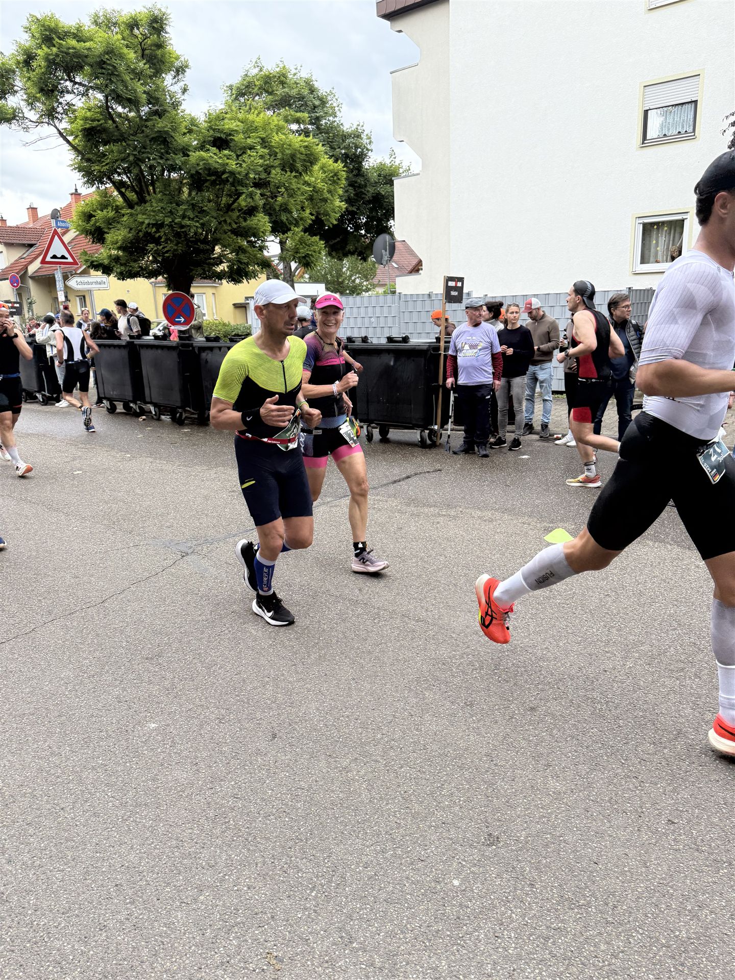 Nach 40:07 Min. komme ich aus dem Wasser und laufe in die Wechselzone T1.