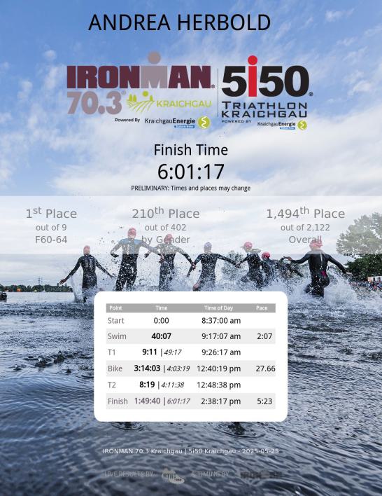 Ich bin erste in meiner Altersklasse 60-64 und überglücklich.