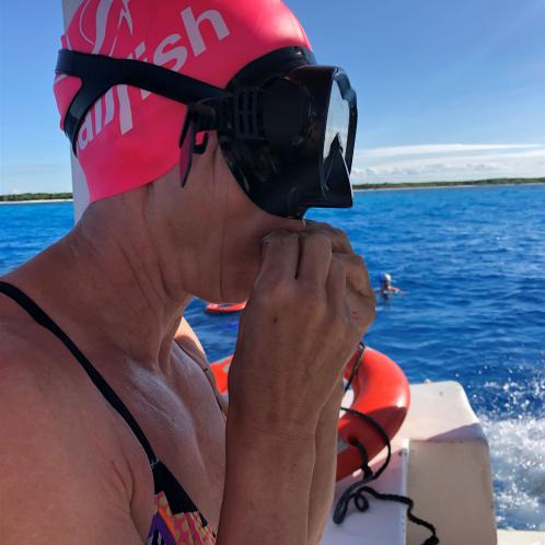 Ab 7:30 Uhr gehen die Agegrouper ins Wasser. Durch den Rollingstart gibt es kein Gedränge. Ich gehe circa um 7:42 Uhr ins Wasser. Es liegen 3,8 km im Meer schwimmen vor mir. Die Wellen meinen es an diesem Morgen gut mit mir. Der Seegang ist verhalten, meine Übelkeit erträglich. Man hat das Gefühl, man schwimmt in einem Aquarium. Man hat eine tolle Sicht. Ab und an sieht man einen Taucher am Meeresboden. Sicherheit wird groß geschrieben. Zumal aufgrund der Wassertemperatur ohne Neo geschwommen wird. Es gibt eine leichte Strömung, was die Schwimmzeit um einiges verkürzt. Die Strecke ist gut markiert, es geht 3.800 Meter in eine Richtung. Nach 1:06:04 steige ich aus dem Wasser.