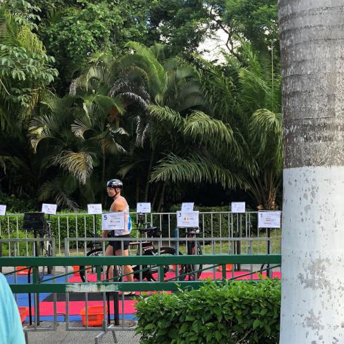 Zügig zum Rad und dann ab auf die erste Runde. Da mein Magen noch immer rebelliert verzichte ich die erste Zeit auf jegliche Nahrungs- bzw. Flüssigkeitsaufnahme. Das erste Stück geht an diversen Hotels und Restaurants vorbei. Die Strecke ist überwiegend geradeaus. Nichts spektakuläres. Ein großes Teilstück verläuft parallel zum Meer, der Ausblick ist einfach toll. Schön, wenn man während einem Rennen noch solch ein Panorama genießen kann. Am Anfang ist die Radstrecke noch etwas voll, das wird jedoch von Kilometer zu Kilometer besser. Ich fühle mich sehr gut und kann mein Tempo fahren. Ich freue mich, wenn ich den ein- oder anderen Athleten überholen kann, das bringt zusätzliche Motivation. Ich versuche die meiste Zeit abgelegt zu fahren, das minimiert den Windwiderstand. Die Verpflegungsstellen sind sehr dicht beieinander, man kann seine Flaschen auffüllen und sich mit Wasser kühlen. Ist perfekt organisiert. Insgesamt muss man 3 Runden fahren. 2 x 63 Kilometer und die letzte Runde noch 54 Kilometer. Ich versuche möglichst konstant mein Tempo zu fahren und fühle mich ausgezeichnet. Es steht ja im Anschluss noch ein Marathon an. Das Gefühl ist toll, als ich nach 3 Runden in Richtung Wechselzone abbiegen kann und bin erstaunt, wie viele erst jetzt auf die 3. Runde gehen. Schnell das TT Bike an einen Helfer abgeben und dann mit dem Laufbeutel ins Wechselzelt. Meine Radzeit von 5:30:34 ist eine tolle Zeit für mich.